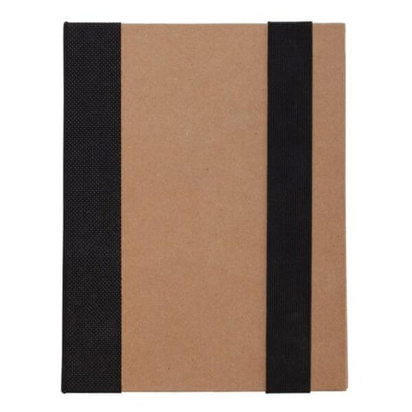 Poznámkový blok v lepenkovom obale s elastickou uzatváracou páskou. Dodáva sa s lepenkovým guličkovým perom s plastovou špičkou a klipom. Obal: 2 mm hrubá lepenka. Vnútri: 80 g bezdrevného papiera 140 strán. 2x 80 g žlté lepiace papieriky, 5 x súprava lepiacich papierikov z PET po 25 lístkoch.