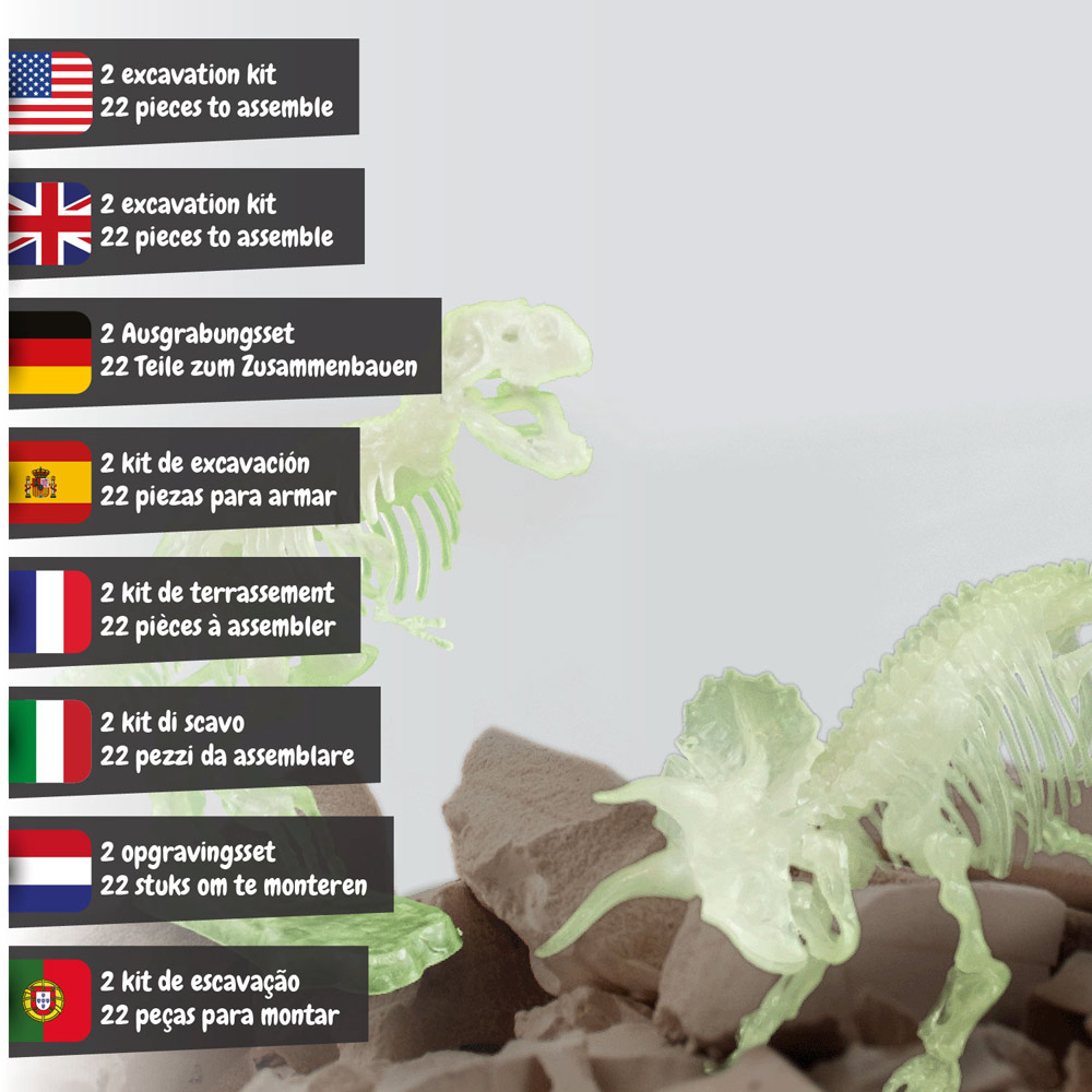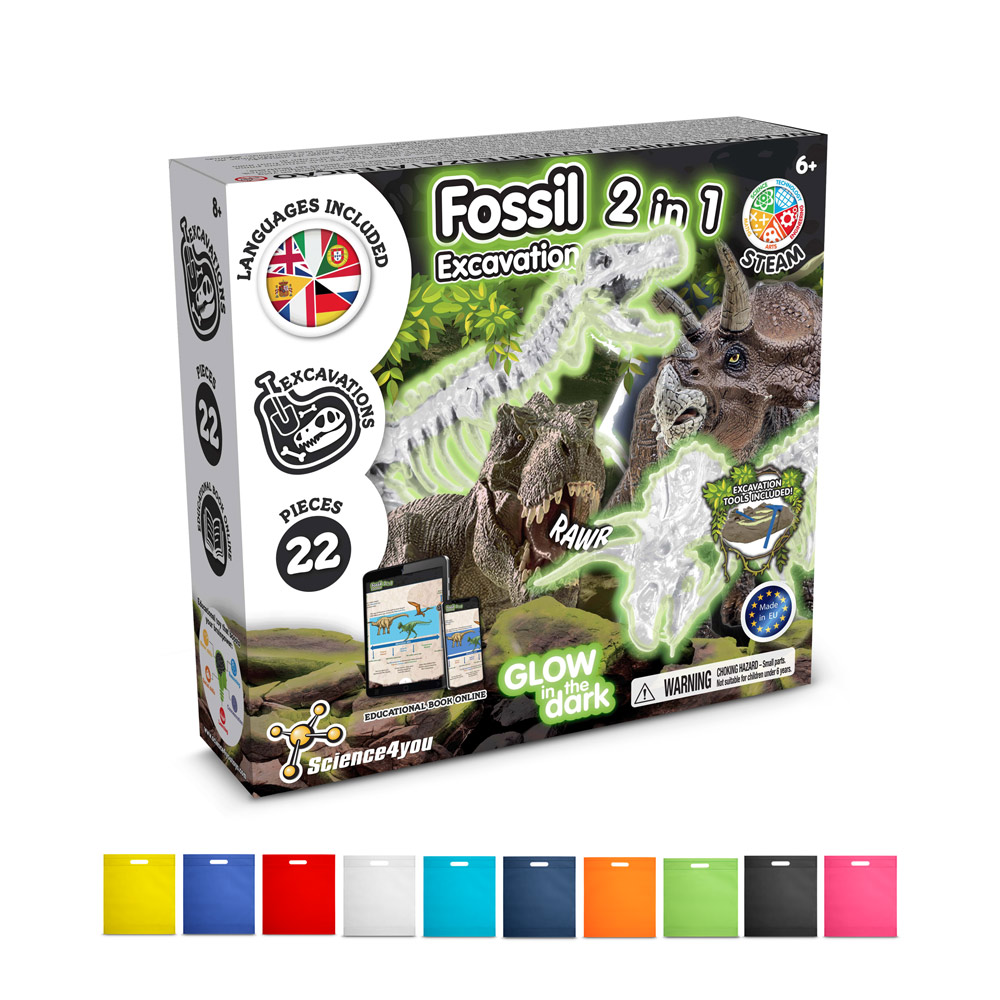 Náučná súprava Dinosaur Fossil Excavations 2 v 1 s návodom na dinosaury. Táto súprava na vykopávky 2 v 1 vám umožní vykopať a zostaviť dve fosílie vašich obľúbených dinosaurov – T-rexa a Triceratopsa – ktoré svietia v tme. Zabavte sa pri učení najlepších výkopových techník a toho, čo spôsobilo vyhynutie dinosaurov.. Odporúčaný vek: 6 + roky. Dodáva sa s darčekovým vreckom z netkanej textílie (80 g/m²). 263 x 220 x 62 mm