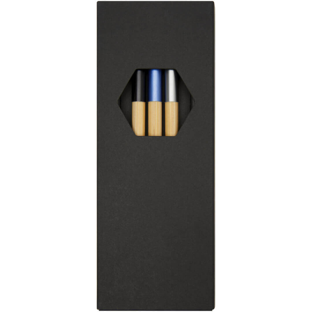 Sada guľôčkových pier s exkluzívnym dizajnom, skladajúci sa z troch guľôčkových pier s farebným akcentom. Guľôčkové pero s modrou hliníkovou doskou je vopred naplnené modrou náplňou, zatiaľ čo zvyšné dve perá sú vopred naplnené čiernou náplňou. Zabalené v darčekovej krabičke.