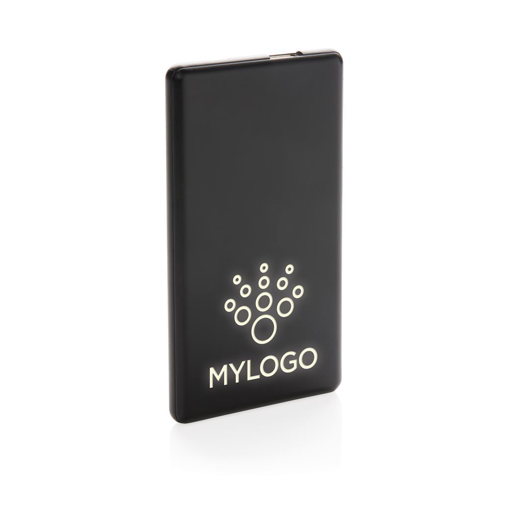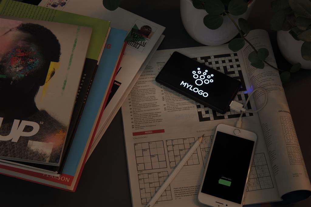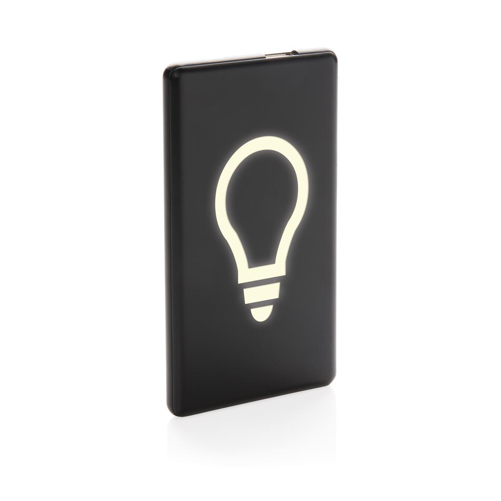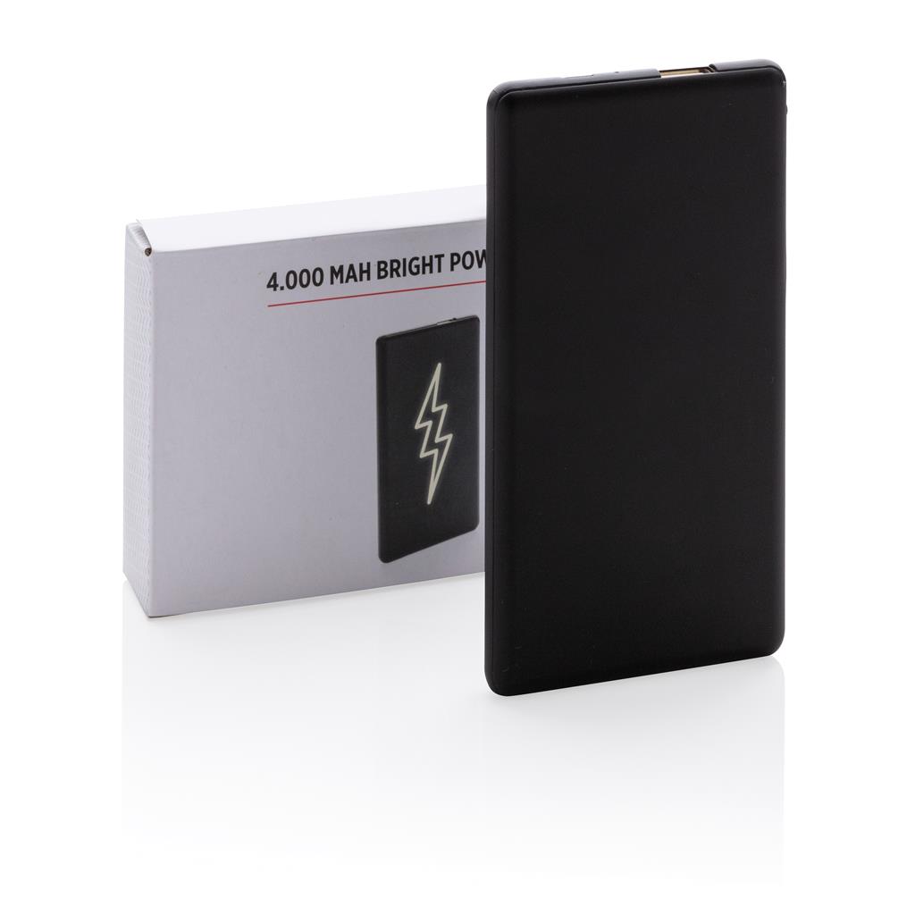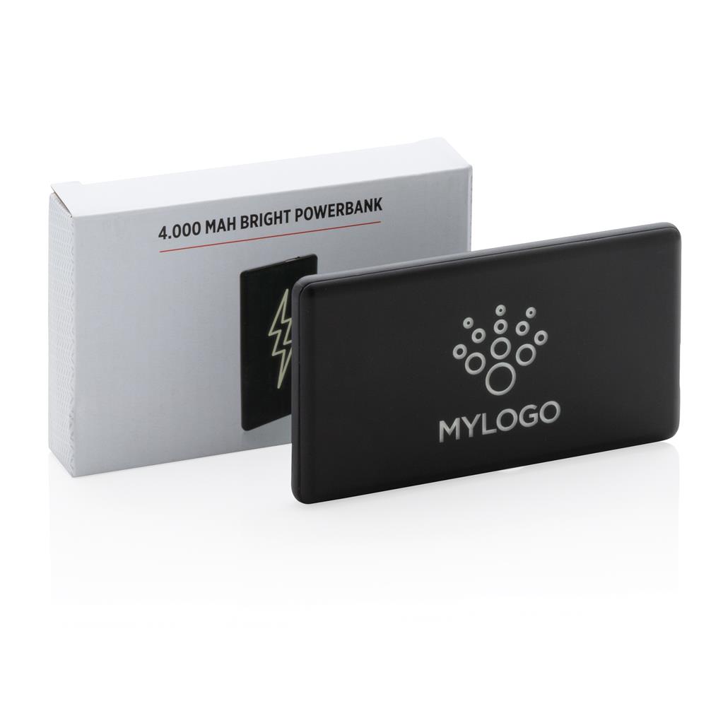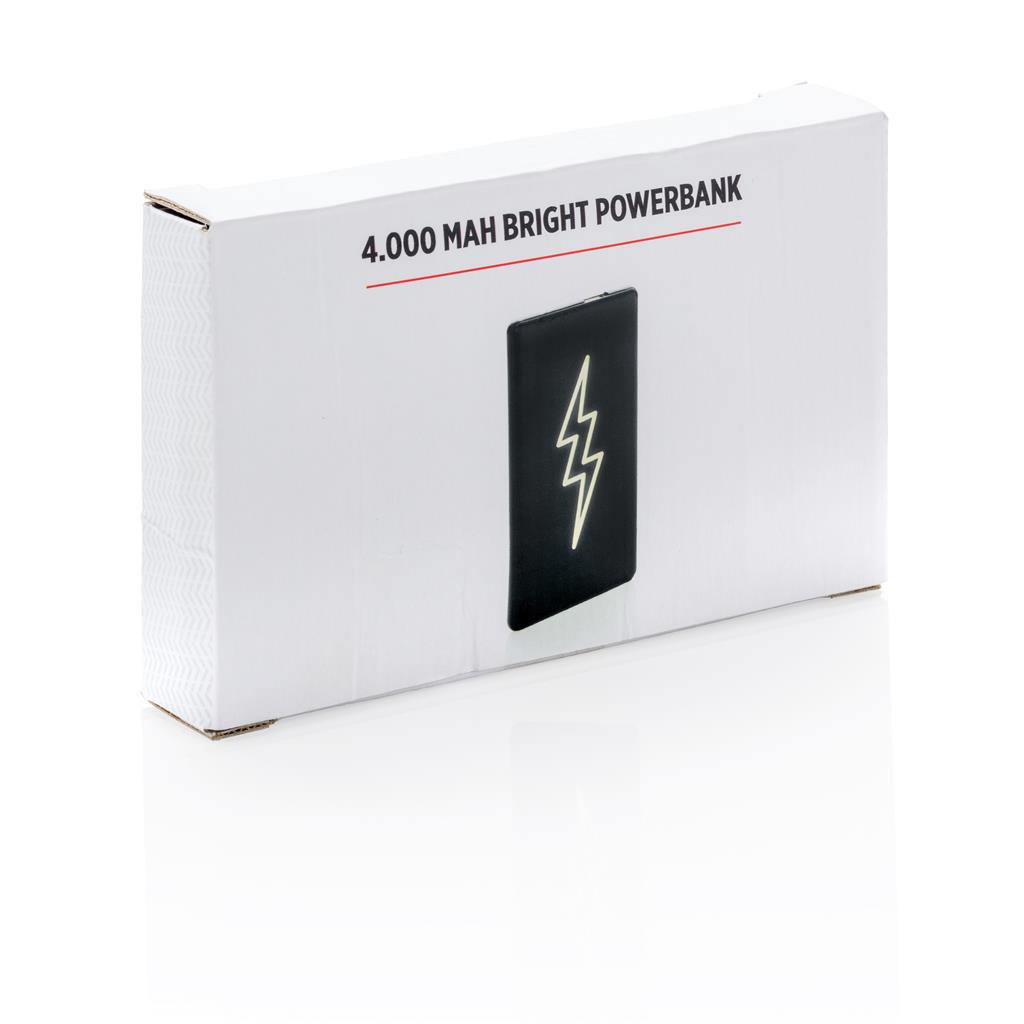 Plochá a odolná powerbanka s lithium-polymérovou 4 000 mAh batériou. Na prednej strane je možné gravírovať logo, ktoré sa pri použití powerbanky rozsvieti a efektne tak zvýraznia váš firemný odkaz....