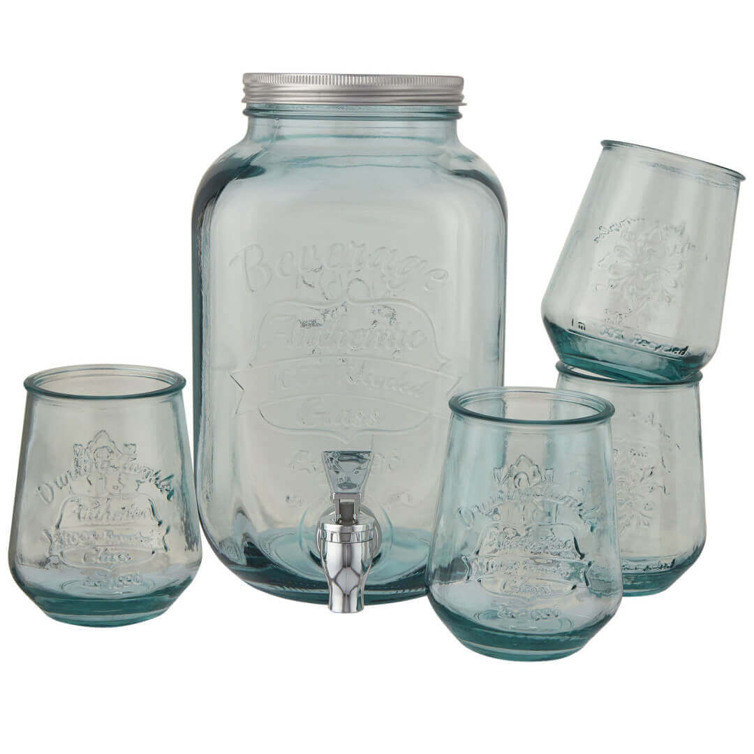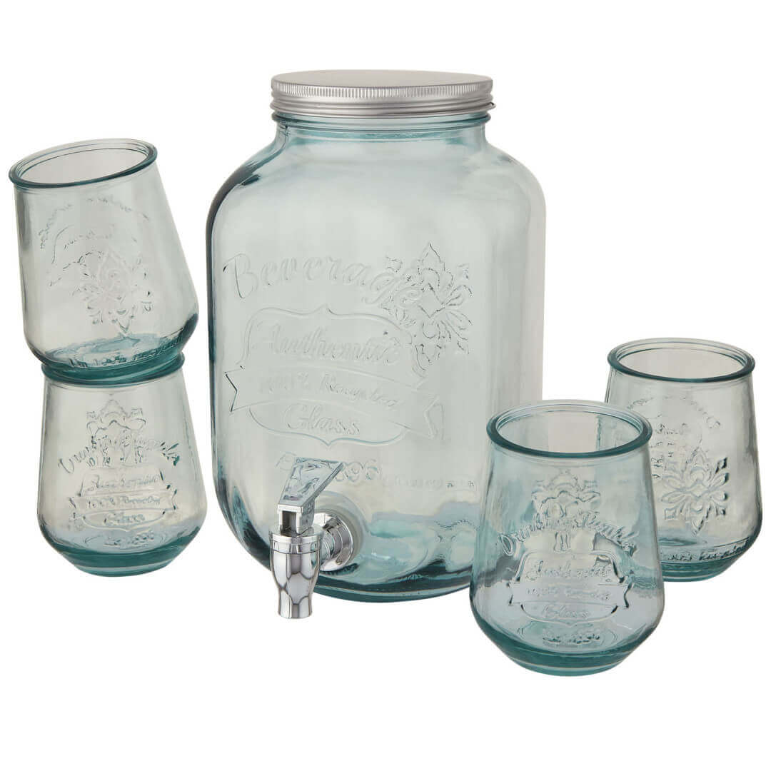 5dielna sada na nápoje zo 100% recyklovaného skla so 4 pohármi (400 ml) a 1 dávkovačom (4 l) s viečkom z nerezovej ocele. S touto nápojovou súpravou s dávkovačom môžete servírovať sangriu, čerstvý džús a ľadový čaj vo veľkom a vaša párty tak bude stále v plnom prúde. Plne zostavený kohútik z nerezovej ocele vždy umožnuje ľahké nalievanie a má dlhú životnosť. Každý kus je vyrobený z recyklovaných sklenených fliaš. Recyklované sklo sa vyrába s použitím menšieho množstva energie, surovín a aditív, než je nutné na výrobu tradičného skla. Vhodné do umývačky.