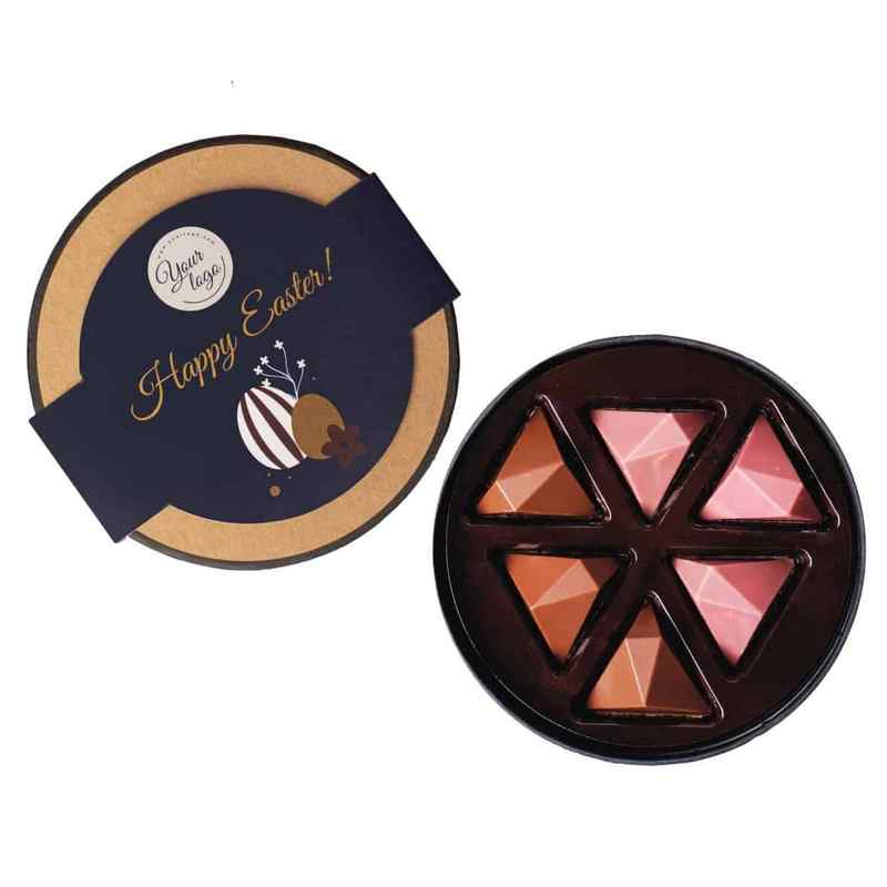 6 čokoládových praliniek ELEGANCE CHOCOLATE BOX (78g) obsahuje čokolády s príchuťami: rubínová čokoláda s pistáciovou náplňou a mliečna čokoláda s orechovou náplňou.