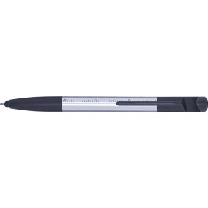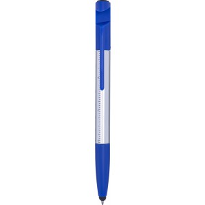 Multifunkčné plastové guľôčkové pero 6 v 1 s otočným mechanizmom. Pero v tvare trojuholníka má gumenú špičku hrotu pre kapacitné obrazovky, držiak telefónu, čistič obrazovky, pravítko a slúži ako dvojdielny skrutkovač. Modrý atrament.