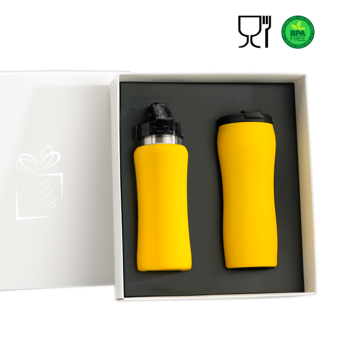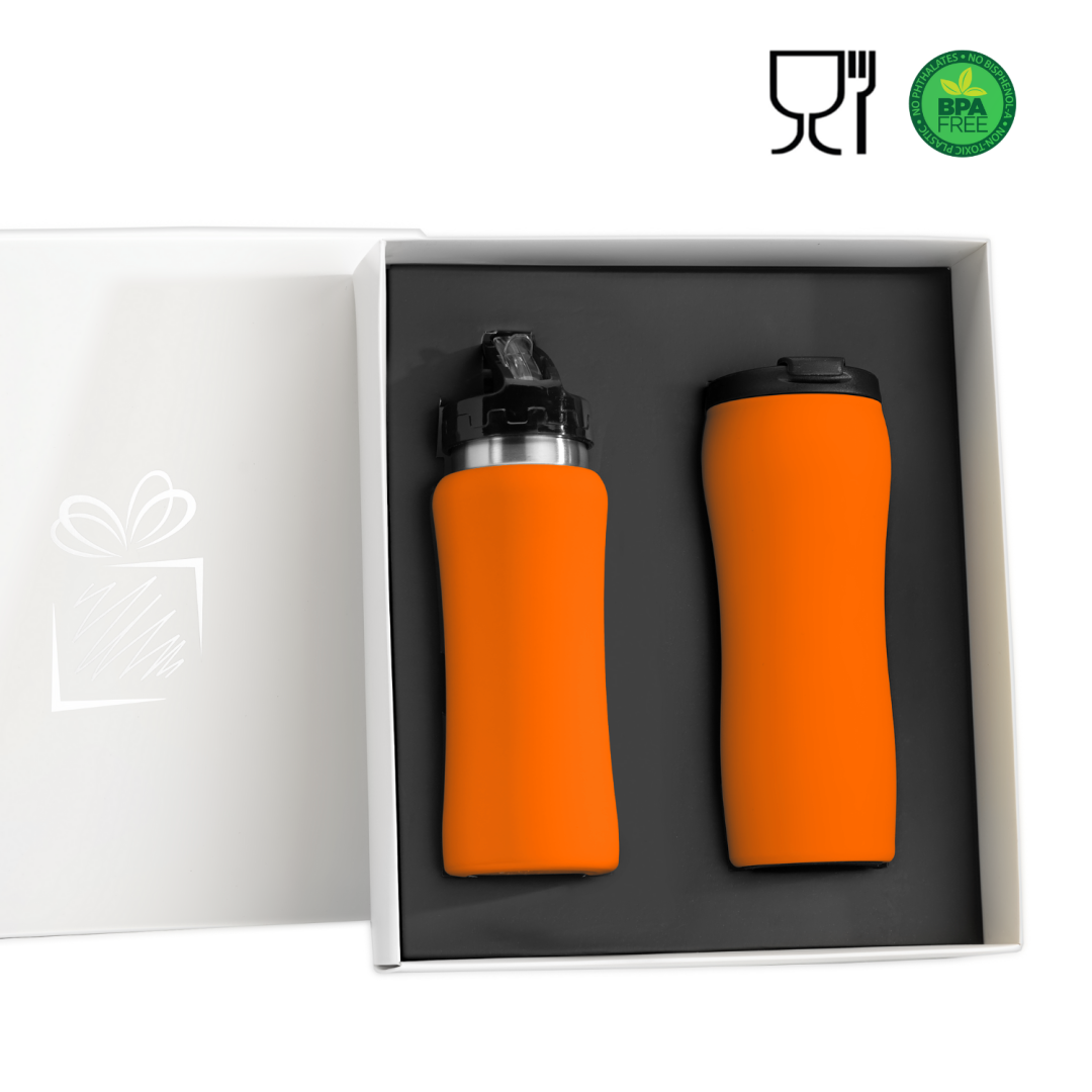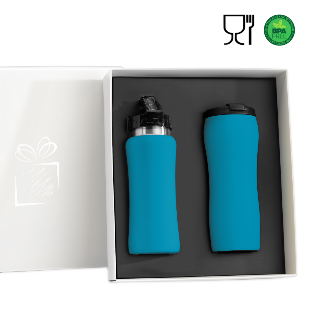 Praktická súprava termohrnčeka a fľaše na vodu s jemným povrchom. Hrnček má vákuovo izolovanú dvojitú stenu a pohodlnú rukoväť, ktorá umožňuje bezpečnú konzumáciu horúcich nápojov. Fľaša na vodu je vybavená ľahko použiteľnou hubičkou na pitie. Súprava je určená pre styk s potravinami a má certifikát BPA (bez bisfenolu). Sada je balená v darčekovej krabičke s výplňou. Značka Colorissimo ponúka moderný dizajn a zaručuje najvyššiu kvalitu reklamných produktov. Sada je zabalená v elegantnej bielej krabičke.
