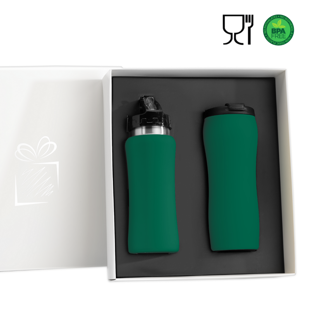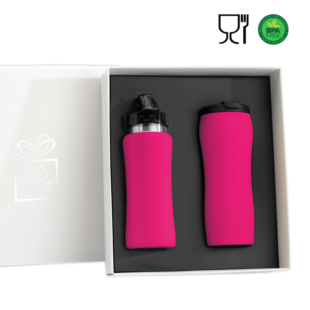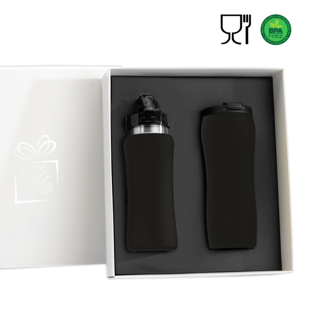 Praktická súprava termohrnčeka a fľaše na vodu s jemným povrchom. Hrnček má vákuovo izolovanú dvojitú stenu a pohodlnú rukoväť, ktorá umožňuje bezpečnú konzumáciu horúcich nápojov. Fľaša na vodu je vybavená ľahko použiteľnou hubičkou na pitie. Súprava je určená pre styk s potravinami a má certifikát BPA (bez bisfenolu). Sada je balená v darčekovej krabičke s výplňou. Značka Colorissimo ponúka moderný dizajn a zaručuje najvyššiu kvalitu reklamných produktov. Sada je zabalená v elegantnej bielej krabičke.