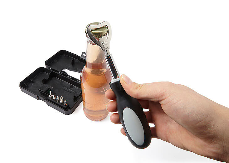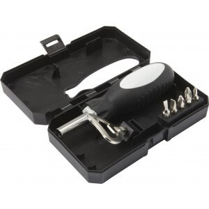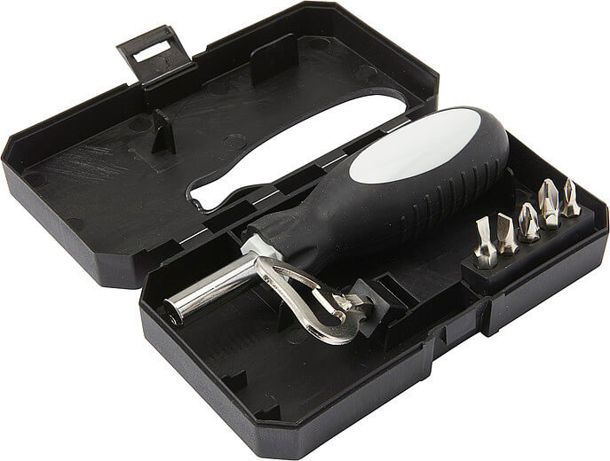 Osemčlenná súprava náradia s niekoľkými skrutkovačmi a otváračom na fľaše, v čiernom obale.