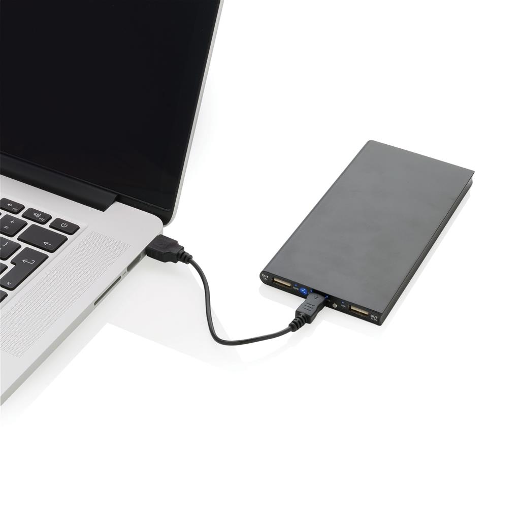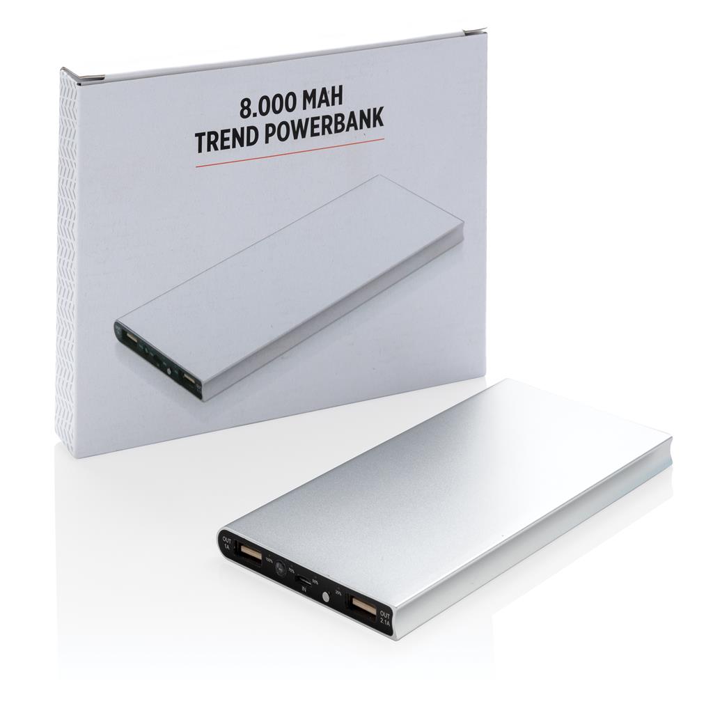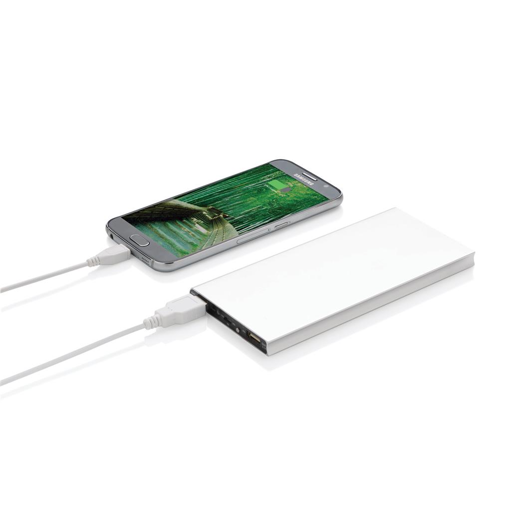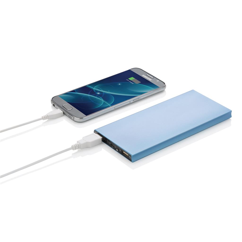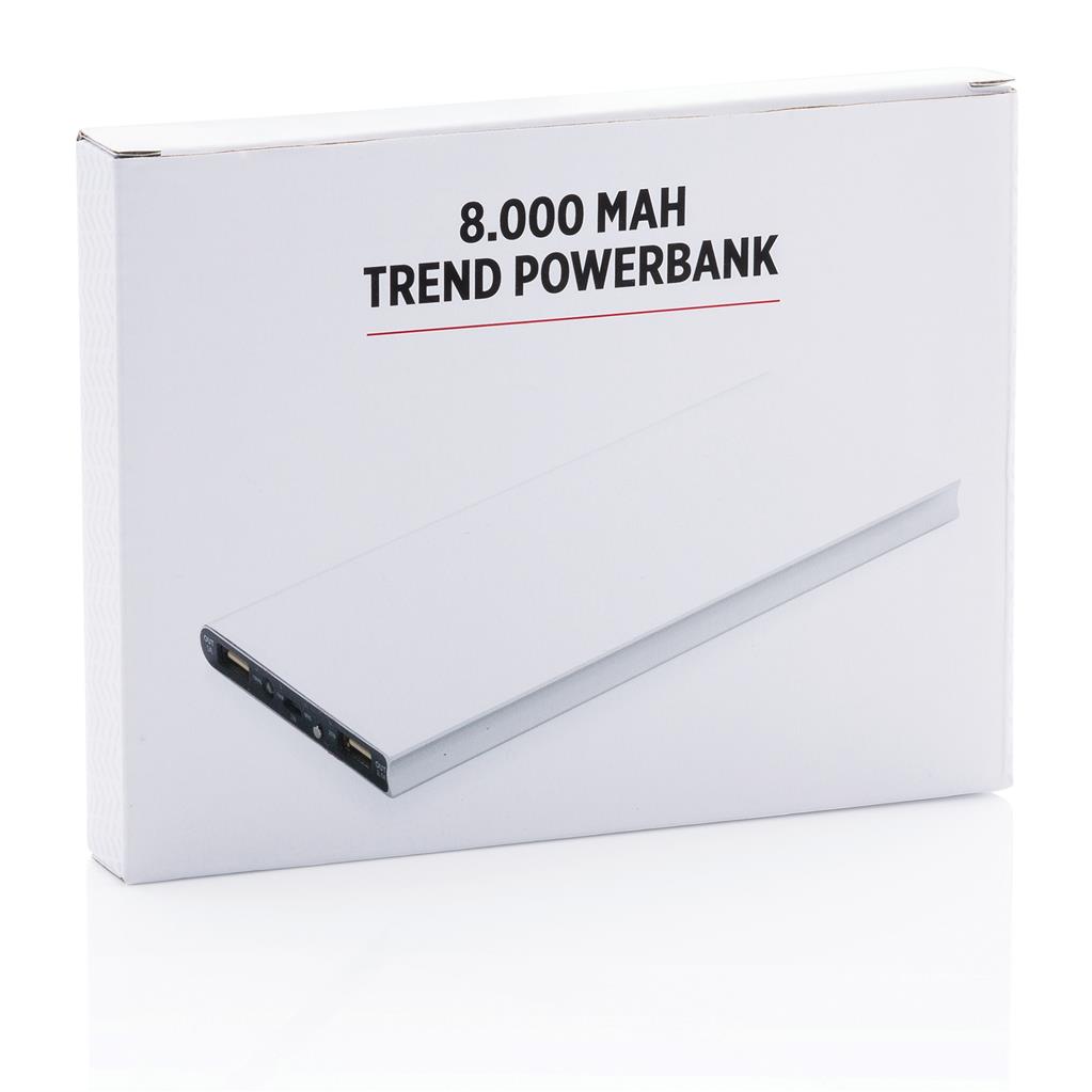 Hliníková powerbanka s dvoma USB porty pre nabíanie mobilných zariadení súčasne. Dostatočná kapacita pre 3–4 dobitia priemerného telefónu alebo dobitie tabletu. Kapacita 8 000 mAh, celkový výstup: 5 V/3,1 A, vstup: 5 V/1 A. Vrátane micro USB kábla. 2 batérií typu Li-poly súčasťou balenia.