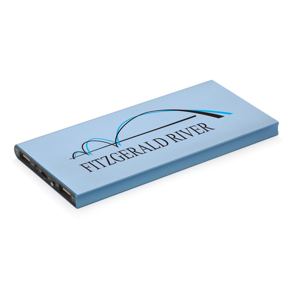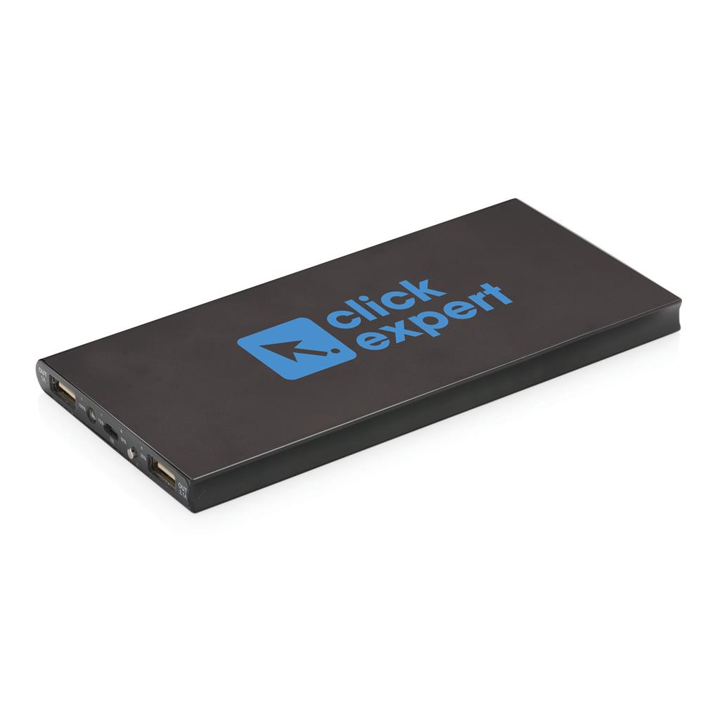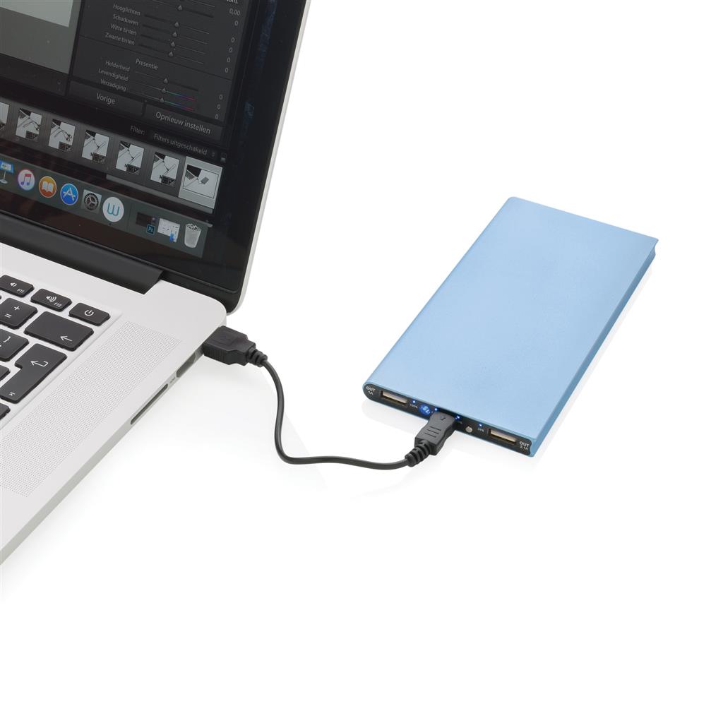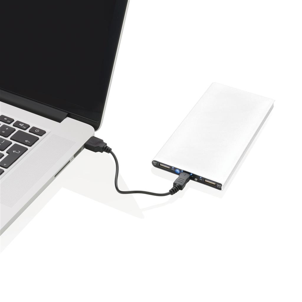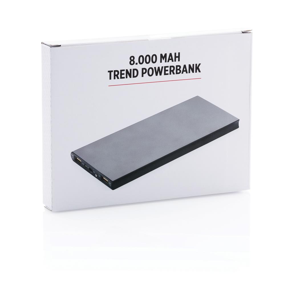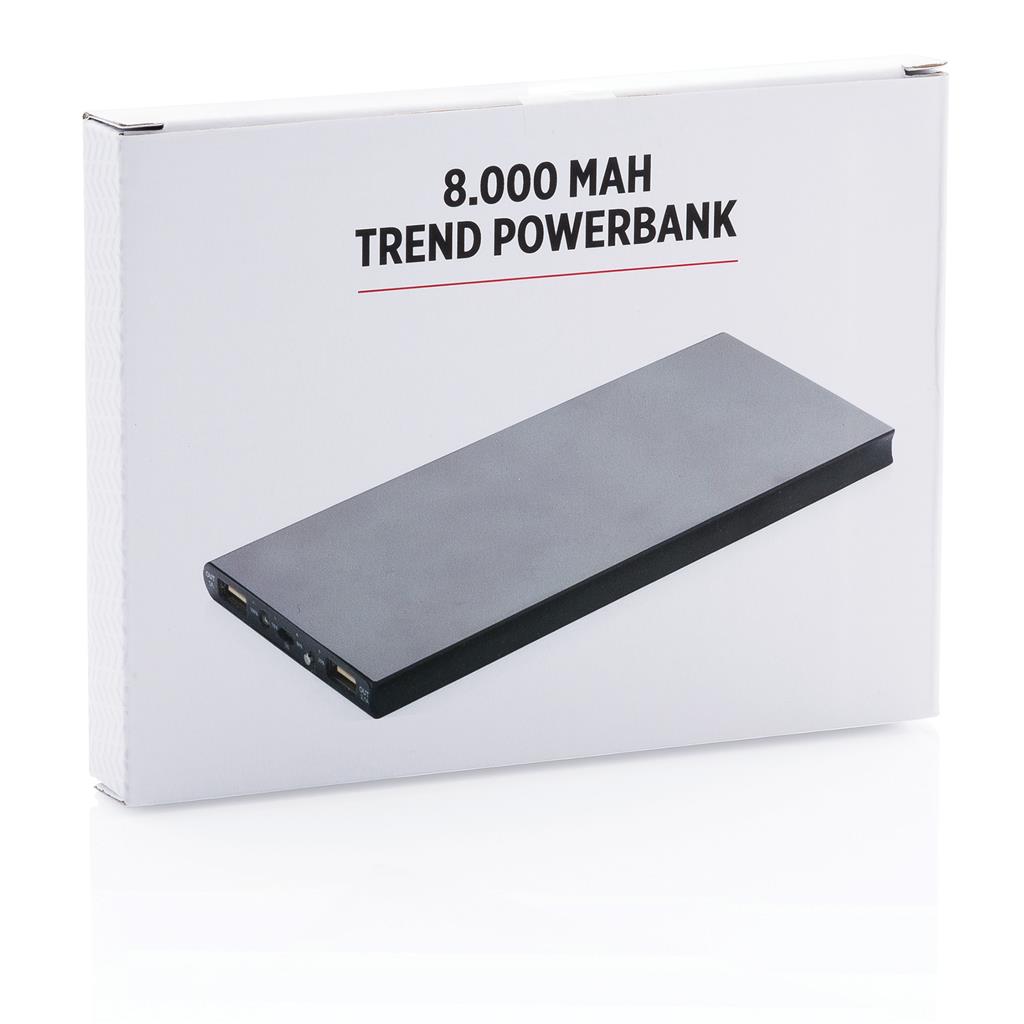 Hliníková powerbanka s dvoma USB porty pre nabíanie mobilných zariadení súčasne. Dostatočná kapacita pre 3–4 dobitia priemerného telefónu alebo dobitie tabletu. Kapacita 8 000 mAh, celkový výstup: 5 V/3,1 A, vstup: 5 V/1 A. Vrátane micro USB kábla. 2 batérií typu Li-poly súčasťou balenia.