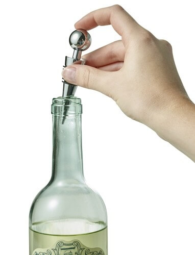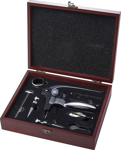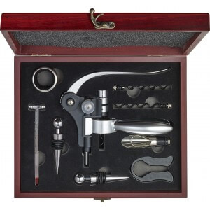 Darčeková sada na víno pozostávajúca z deviatich kusov nehrdzavejúcej ocele: dve zátky, odkvapkávač, teplomer, rezačka fólie, lievik a vývrtka. Darčeková krabička je vyrobená z dreva.