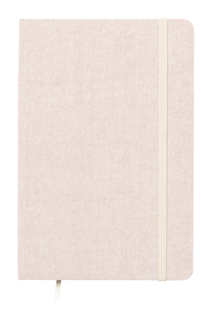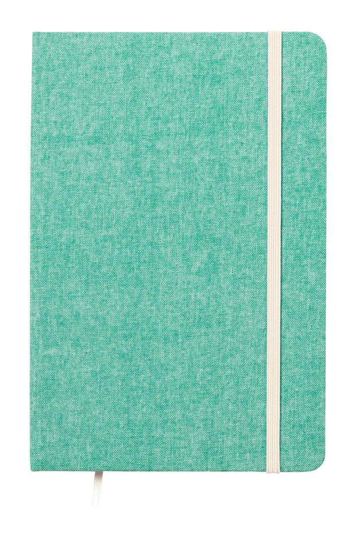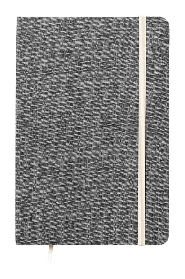 Blok A5 potiahnutý 100% recyklovanou bavlnou so 100 linajkovými listami, záložkou a gumičkou.