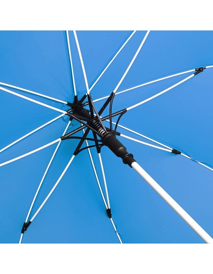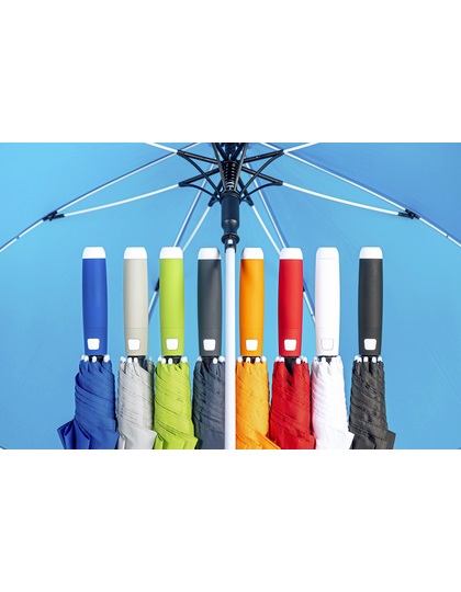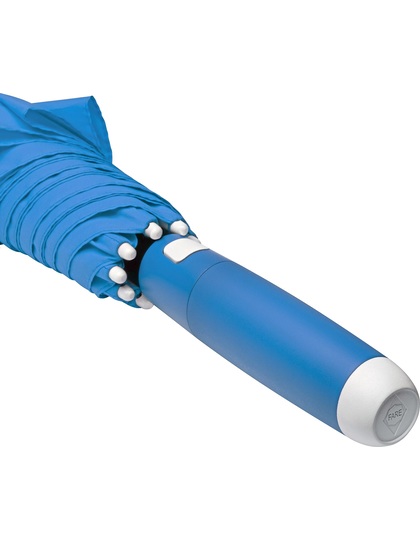 Praktické automatické rýchle otváranie. Vysoko kvalitný vetru odolný systém pre maximálnu pružnosť rámu pri silnejších nárazoch vetra, flexibilné biele laminátové koľajnice. Robustná oceľová tyč s bielym plastovým obalom. Polyesterový materiál strechy z recyklovaných plastov. Biele plastové koncovky. Elegantná rukoväť s mäkkým povrchom, integrovaným uvoľňovacím tlačidlom a možnosťou reklamného označenia. Rukoväť: plast.