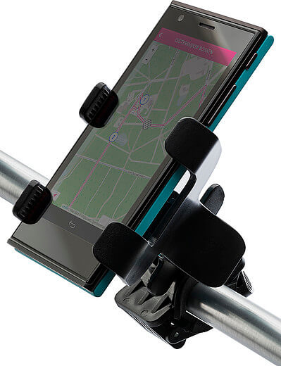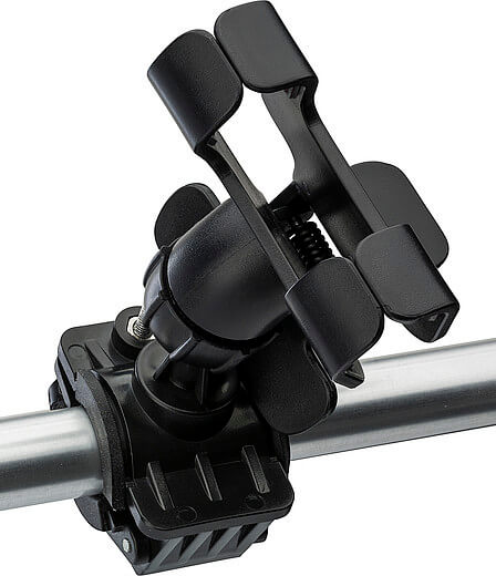 Plastový nastaviteľný držiak mobilného telefónu na bicykel; držiak na mobilný telefón sa môže pohybovať v niekoľkých polohách. Držiak je možné umiestniť na riadidlá a nastaviť tak, aby sa zmestili.