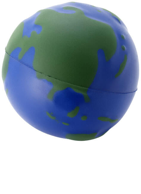 Antistresový glóbus. Antistresový loptička s dizajnom zemegule. Antistresové pomôcky sa nepatrne líšia v hustote, farbe, veľkosti a hmotnosti v dôsledku postupu lisovania, čo môže zabrániť presnému a jednotnému potlače. Potlač sa môže narušiť. Iba základné farby. PU pena.