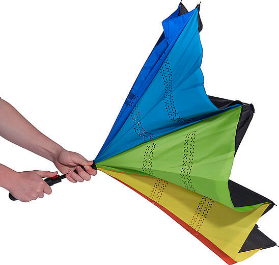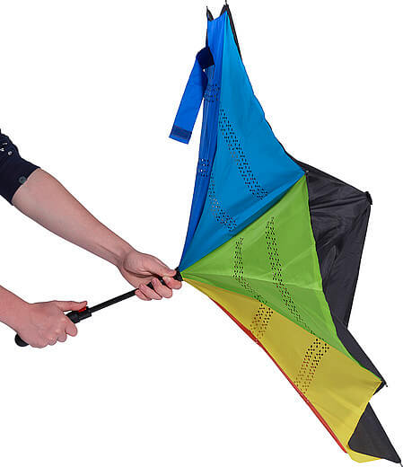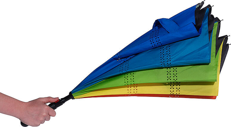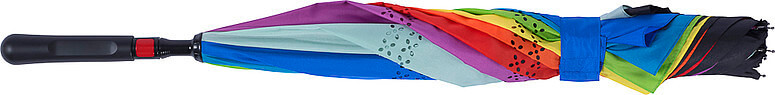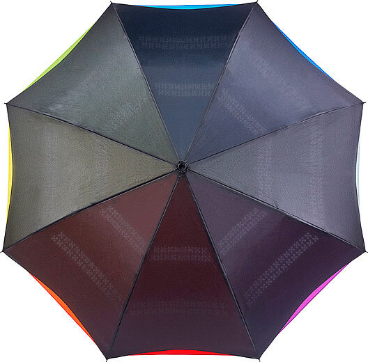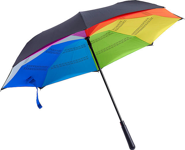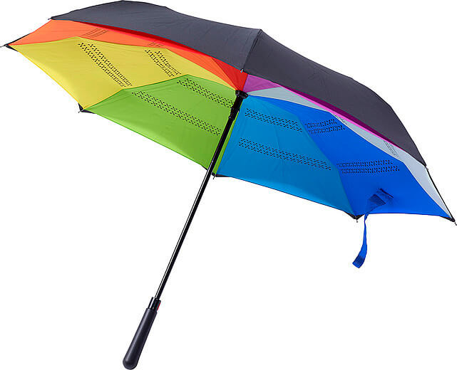 Automatický obojstranný dáždnik (190T) s ôsmimi panelmi. Kovový driek a rám, laminátové rebrá a plastová rukoväť. Dáždnik má dve vrstvy; čierna vrchná vrstva a viacfarebná spodná vrstva. Otvorí sa automaticky.
