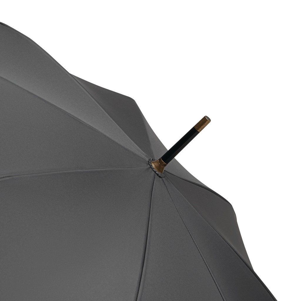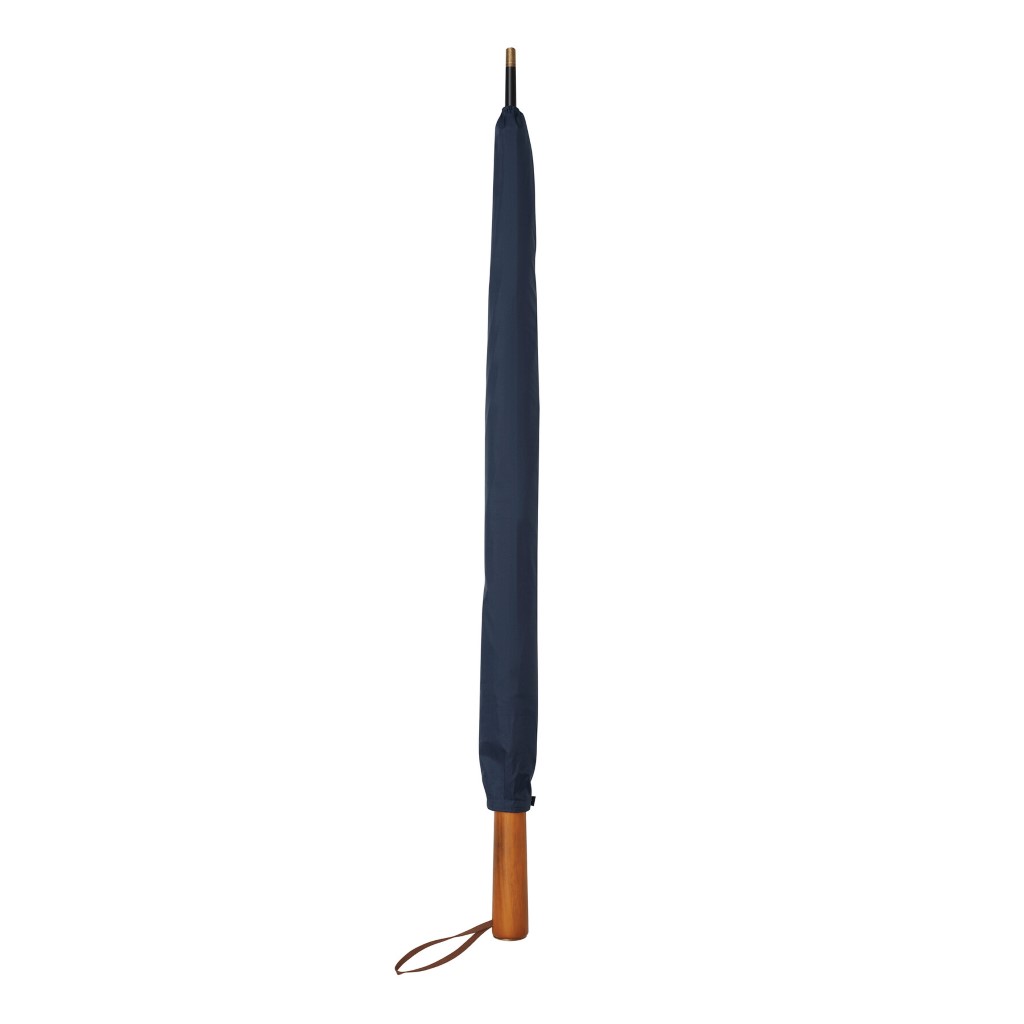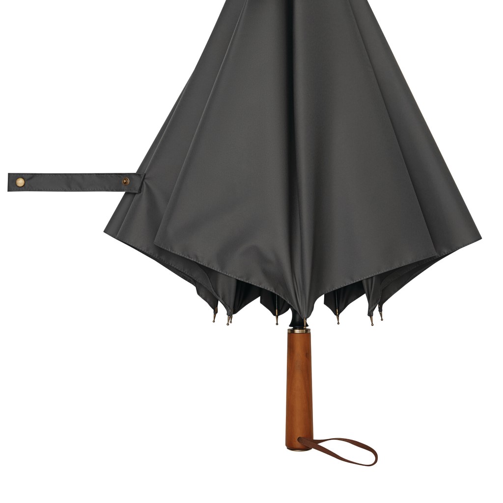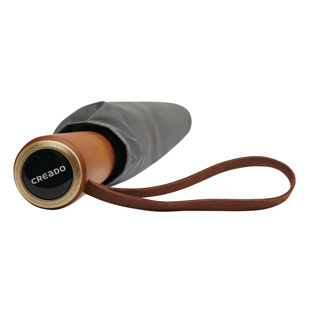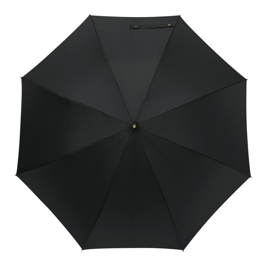 Automatický tyčový dáždnik POLKA: s čiernou kovovou tyčou, rebrami zo sklených vlákien, kovovými hrotmi, rovnou drevenou rukoväťou s mosadzným tlačidlom na automatické uvoľnenie a s výčnelkom "CREADO" na rukoväti, vrchnákom a puzdrom z prvotriedneho polyesterového ponže, zatváracím popruhom so stláčacím tlačidlom