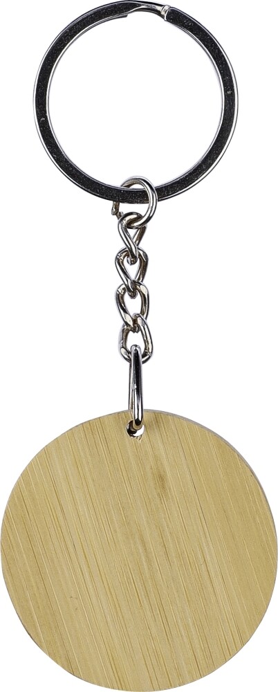 Bambusová kľúčenka s čiernou pogumovanou gravírovanou platničkou z nehrdzavejúcej ocele vo vnútri, okrúhleho tvaru. Farba po gravírovaní je lesklá chrómová. Jednotlivo balené v hnedej kartónovej obálke. Rozmery: 2,6 x 10 x 0,5 cm