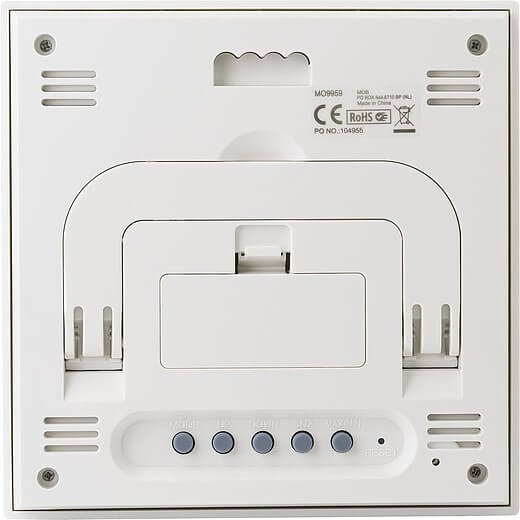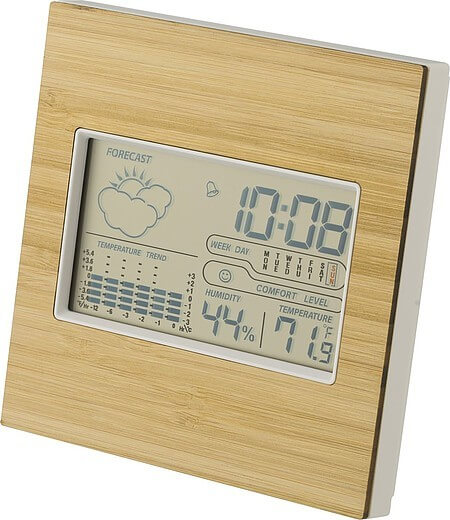 Meteostanica z bambusu, ABS a skla so skladacím stojanom, ktorý sa dá uzamknúť do niekoľkých rôznych polôh. Funkcie: čas, kalendár, prehľad týždňa, budík a opakované budenie, informácie o teplote, vlhkosti a počasí. Vrátane batérií.