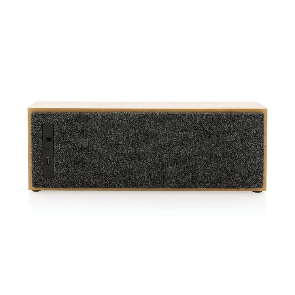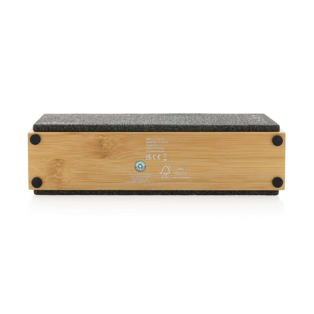 Luxusný 10W reproduktor s čistým zvukom a silnými basmi. Vonkajší plášť je vyrobený zo 100% certifikovaného bambusu FSC. Plastové komponenty sú vyrobené z recyklovaného ABS s certifikáciou RCS (Recycled Claim Standard). Celkový recyklovaný obsah: 23 % na základe celkovej hmotnosti položky. Certifikácia RCS zaisťuje kompletne certifikovaný dodávateľský reťazec recyklovaných materiálov. Reproduktor je dodávaný s BT 5.1 pre jednoduché a plynulé ovládanie až do vzdialenosti 10 metrov a nízku spotrebu energie. Batéria s kapacitou 2 000 mAh umožňuje prehrávanie až 6 hodín a možno ju plne nabiť za 2 hodiny. S funkciou zdvihnutia a mikrofónom na prijímanie (video) hovorov. Balené, ak FSC mix kraft box. Vrátane nabíjacieho kábla z recyklovaného TPE s certifikáciou RCS. 1 batéria typu 18650 súčasťou balenia.