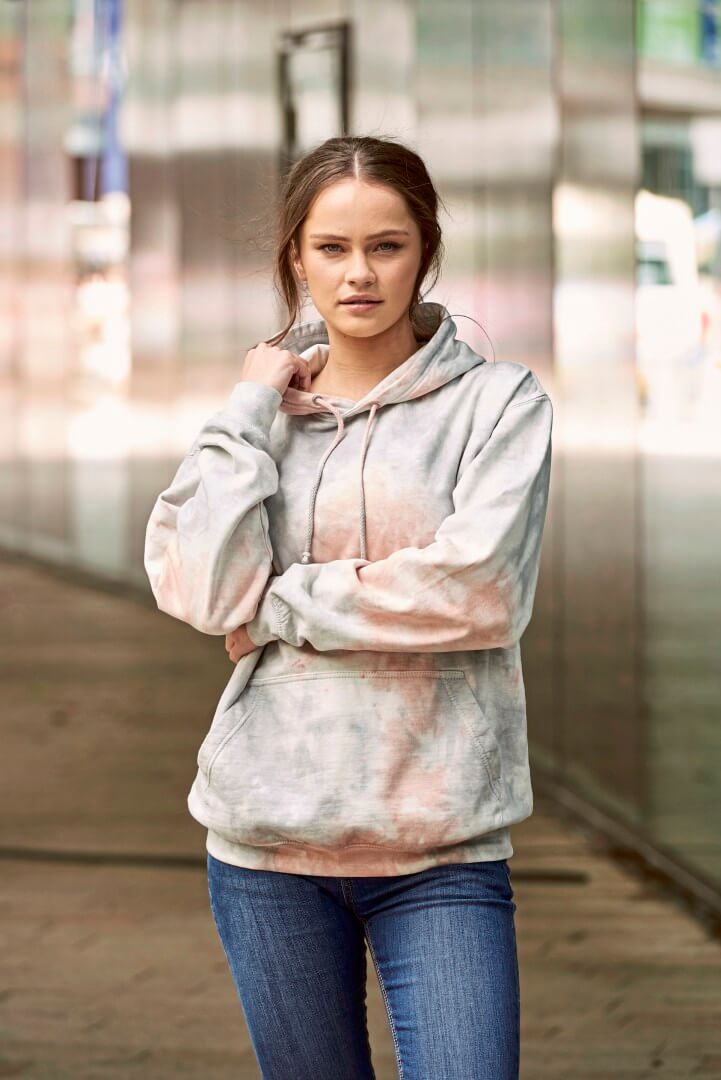 Kruhovo dopriadaná bavlna | Voľný strih | Detail dvojitého prešitia | Dvojitá látková kapucňa s okrúhlymi sťahovacími šnúrkami | Vrecko klokanka | Česaný fleec vo vnútri | Žebrované manžety a lem | Batikovaný vzhľad | Každý kus je jedinečný | Štítok s veľkosťou