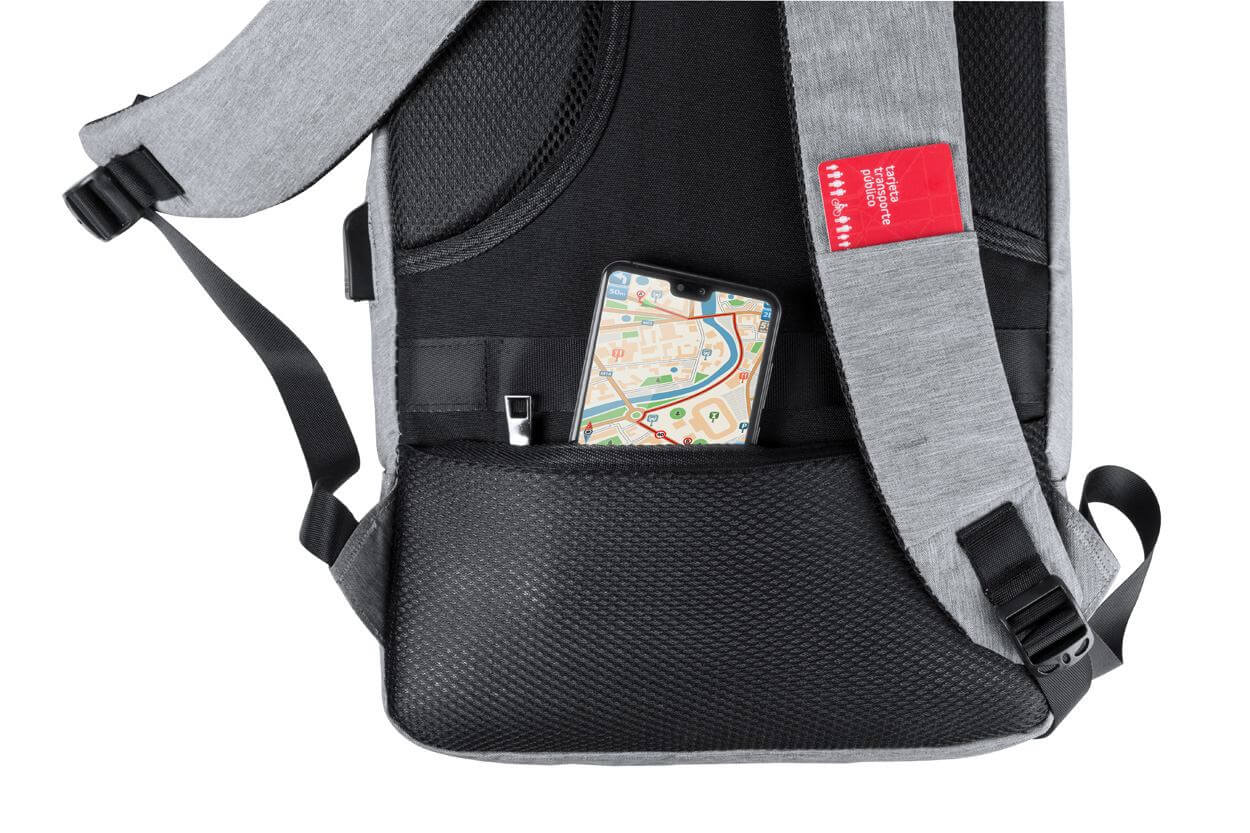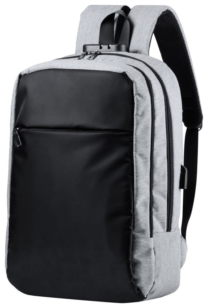 Vodeodolný batoh s mnohými priehradkami na zips, vypolstrovanou priehradkou na laptop, vypolstrovaným chrbtom a ramennými popruhmi. S vstavaným USB pripojením pre power banku a bezpečnostným zámkom. 300D polyester.