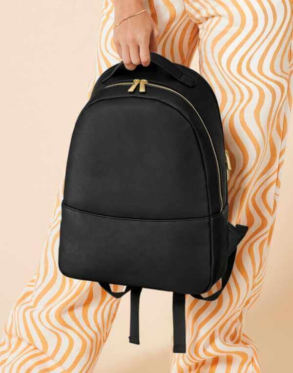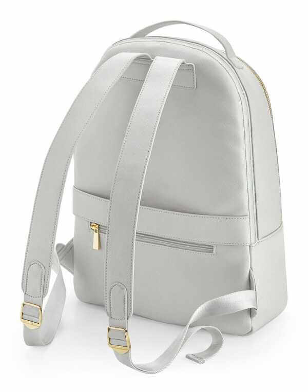 100% polyuretán (kožený vzhľad), jemné Saffiano s mäkkou podšívkou na dotyk, lesklé kovové zipsy, rukoväť a nastaviteľné ramenné popruhy z rovnakého materiálu, popruh na rukoväť batožiny na kolieskach, hlavná priehradka na zips, polstrovaná priehradka kompatibilná na notebook do 14", vnútorné organizačné vrecko a držiak na fľašu, diskrétne vrecko na zadnom paneli na zips, vnútorné vrecko na cennosti na zips, štítok TearAway pre jednoduchú zmenu značky, kapacita: 10 litrov, rozmery: 30x41x11 cm, max. výšivka: 18 obrúčok, max. tlačová plocha: 19x19 cm