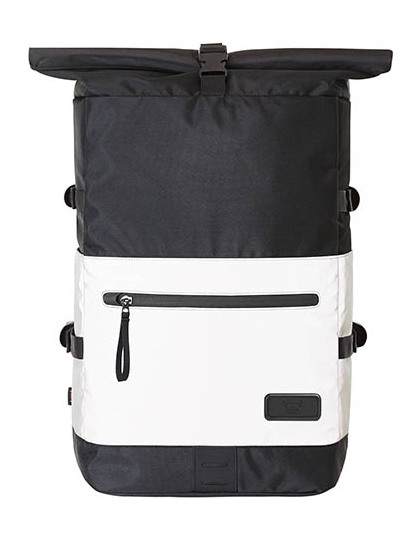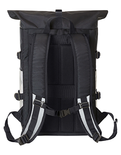 Štýlový reflexný batoh s rolovacím horným okrajom, hlavným oddielom na zips a zapínaním na pracky | Nosič loga HFL® | Polstrované vložené vrecko a vnútorný oddiel zo sieťoviny na zips | Dve bočné vložené vrecká | Nastaviteľné popruhy | Predné vrecko na zips | Možnosť upevniť LED svetlo na bicykel | Zadné upevňovacie pútko na madlá vozíka | Skrytý oddiel na zips | Systém polstrovaných popruhov a výškovo nastaviteľným hrudným popruhom | Ucho | Dodávka bez dekorácie/obsahu.