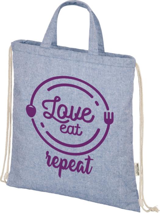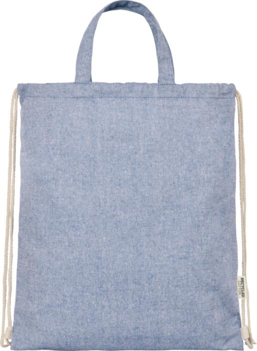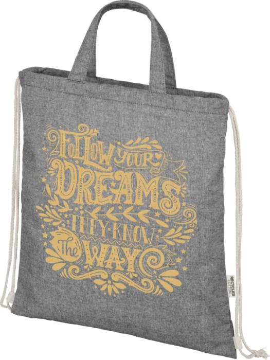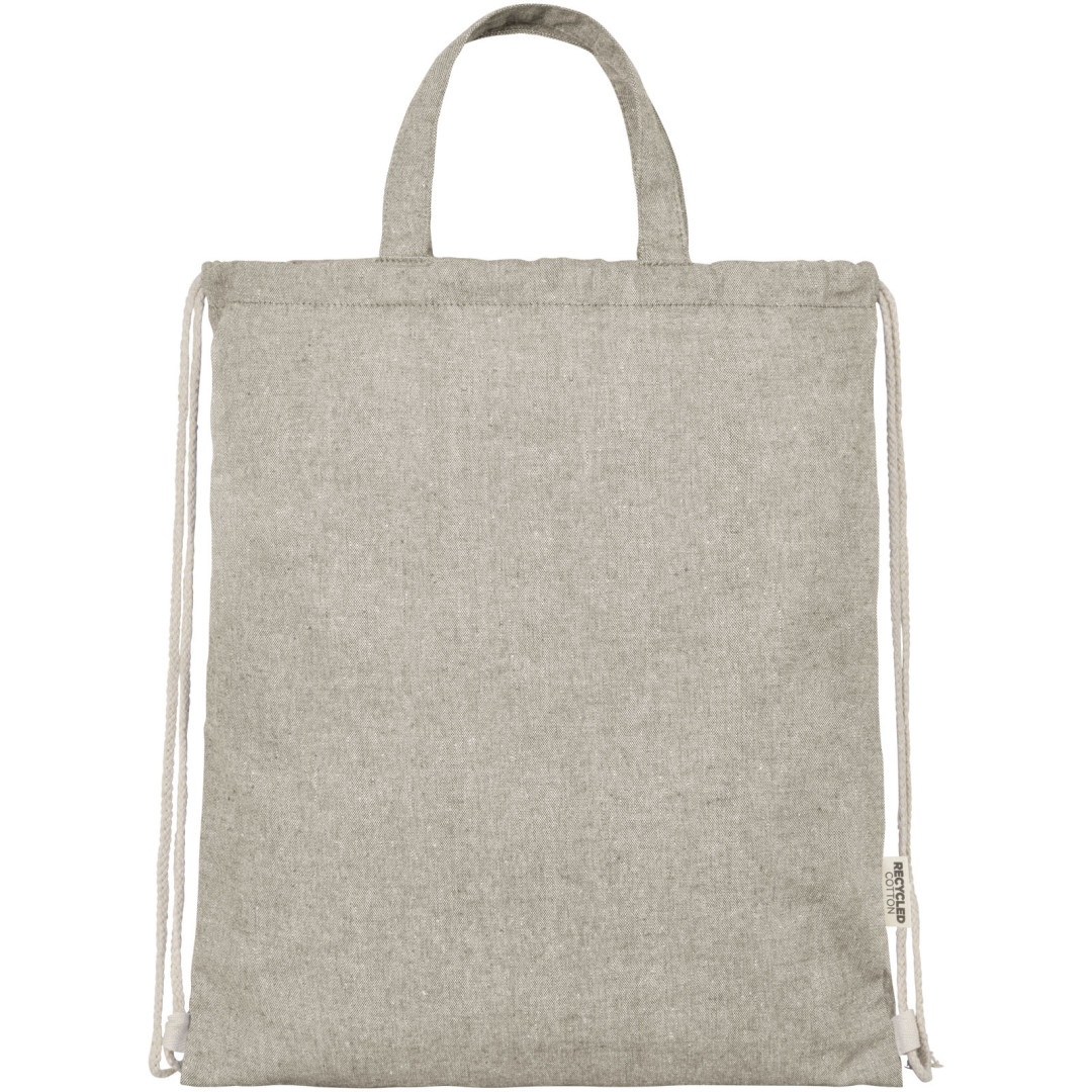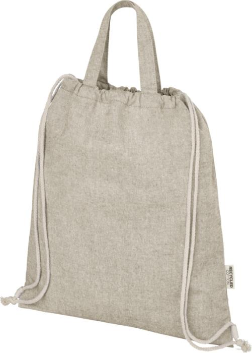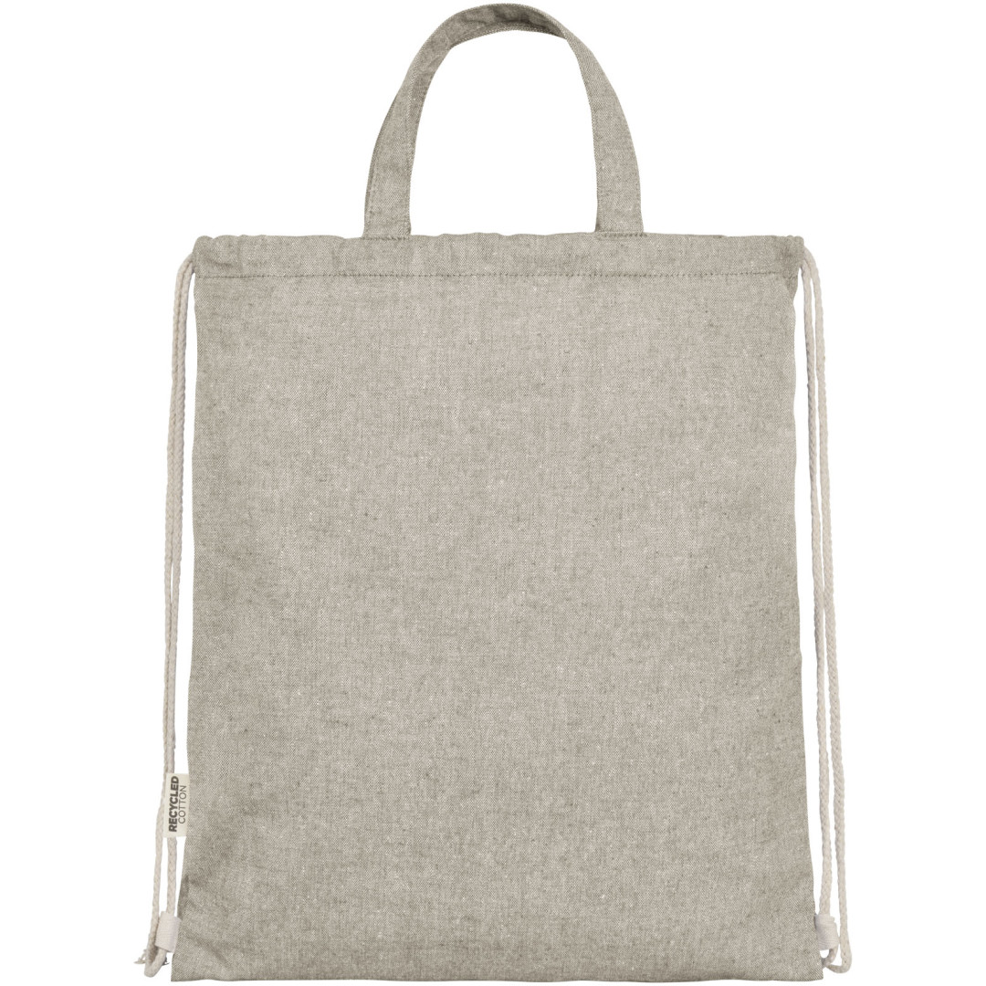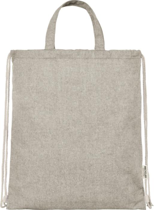 Šnúrkový batoh vyrobený zo zmesi recyklovanej bavlny a polyesteru o gramáži 150 g/m². Veľký hlavný oddiel uzatvárateľný bavlnenou šnúrkou v prírodnej farbe. Recyklovaná bavlna pochádza z výrobného odpadu textilných tovární, vznikajúceho počas procesu rezania. Podobné farby sú zmiešané, takže ďalšie farbenie nie je nutné. Vzhľadom na povahu recyklovanej bavlny môže dôjsť k veľmi miernym farebným odchýlkam. Táto vlastnosť výrazne prispieva k autentickejšiemu vzhľadu. Každý batoh je tiež dodávaný s indikátorom Aware™. Táto inovatívna funkcia umožňuje používateľom sledovať pôvod a cestu ich položky prostredníctvom QR kódu, čím zvyšuje transparentnosť v dodávateľskom reťazci a podporuje pevnejšie prepojenie medzi produktom a jeho výrobným procesom. Nosnosť do 5 kg. Dĺžka rukoväte: 14 cm. 80% recyklovaná bavlna a 20% recyklovaný polyester.