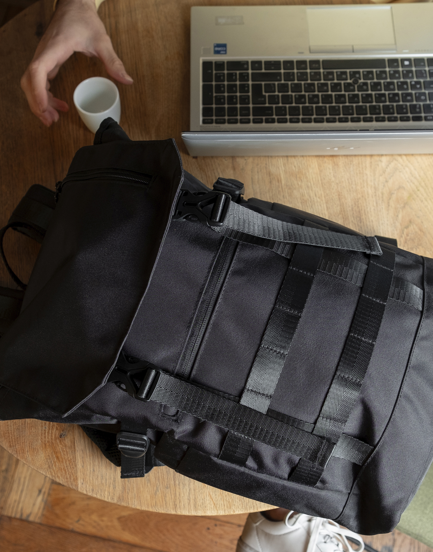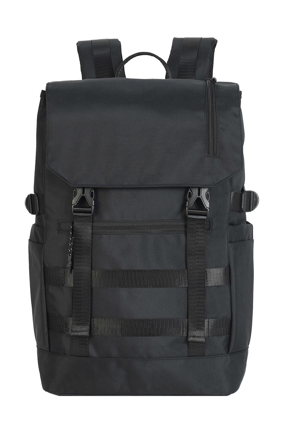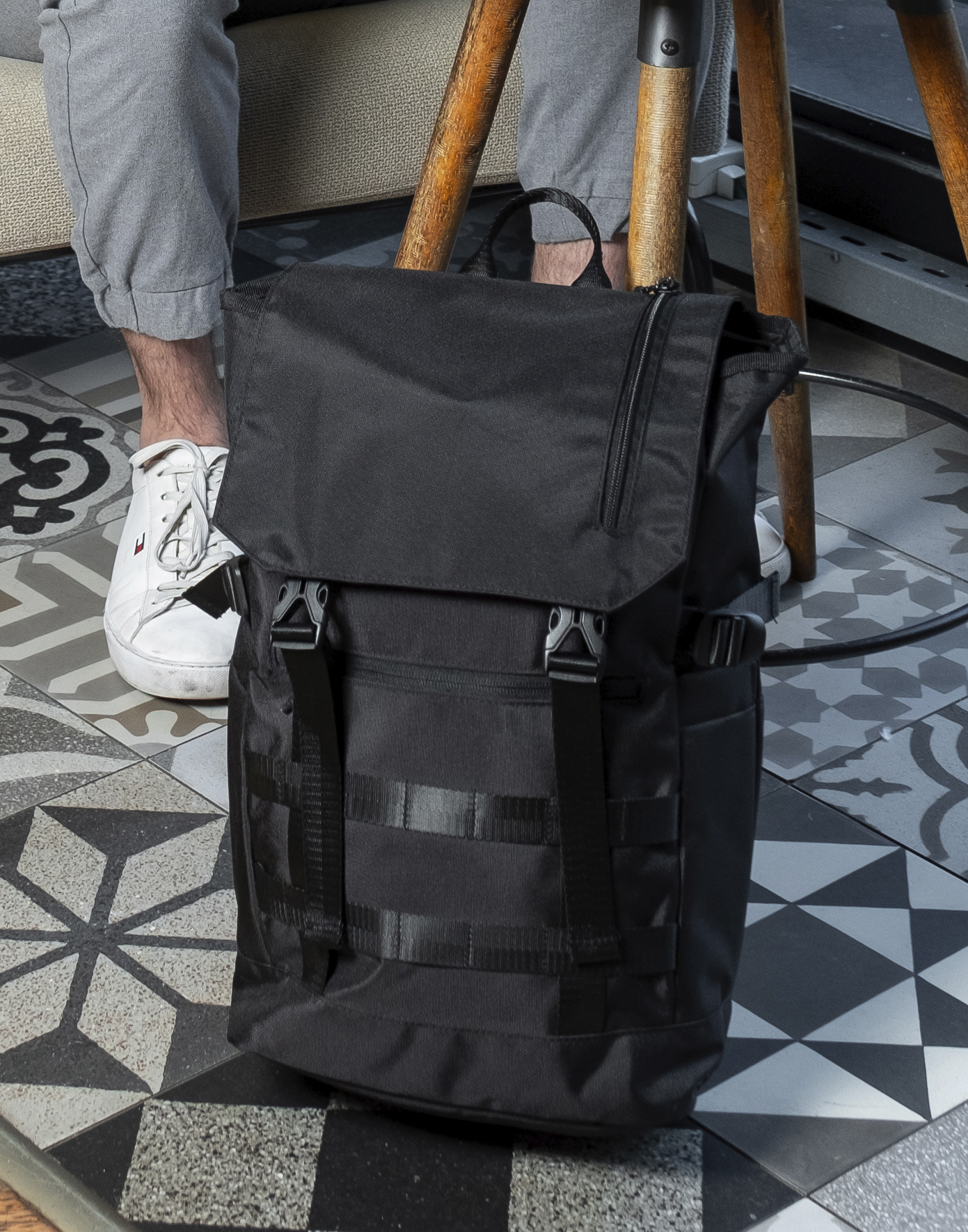 100% polyester (600D, "Gucci Nylon") batoh vo "vojenskom" štýle rukoväť, polstrované ramenné popruhy s hrudným popruhom, vákuové tvarovanie polstrovaného zadného panelu, veľká centrálna priehradka, ktorá sa môže zväčšiť až na 4 litre s príklopkou a vreckom na zips, vnútorné polstrované vrecko, do ktorého sa zmestí 15,6"-17" notebook so sieťovaným vreckom na zips, predné vrecko na zips, na bokoch strečové popruhy, 2 bočné vrecká systém Mole na prednej strane, kapacita: 21 litrov, rozmery: 29 x 19 x 46 cm, vhodné pre sieťotlač, sublimáciu alebo výšivku, max. výšivka: 14 (tubular hoop), max. plocha pre potlač: 14 x 10 cm