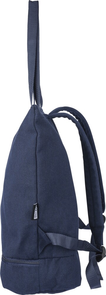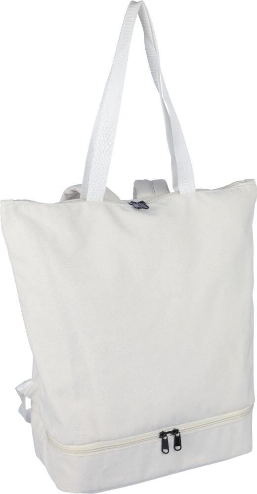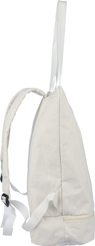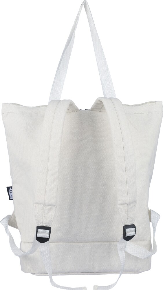 Batoh z recyklovanej polybavlny (330 g/m2) s podšívkou z polyesteru 210D. Má veľkú hornú priehradku na zips, spodnú priehradku na zips, dve vnútorné priehradky a jednu vonkajšiu priehradku na zips. Dizajn zahŕňa dlhé uchá a polstrované nastaviteľné popruhy. Kapacita: 30 l. Nosnosť: 15 kg. Rozmery: 44 x 16 x 44 cm
