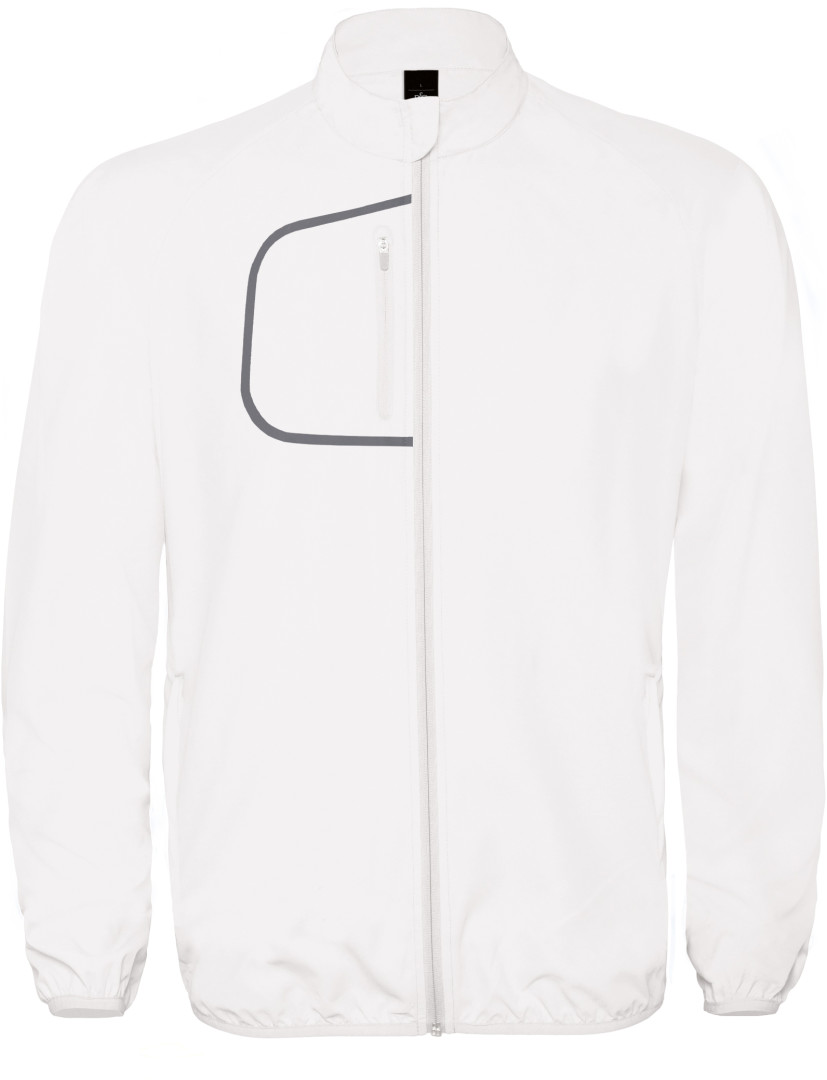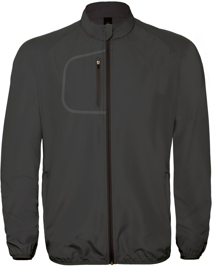 100% ľahký polyester, pánska bunda, 2 bočné vrecká na zips a náprsné vrecko s výrazným prešitím, na ramenách a leme elastické švy, priedušný materiál