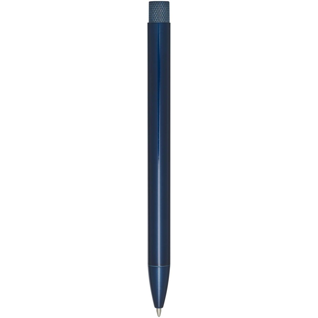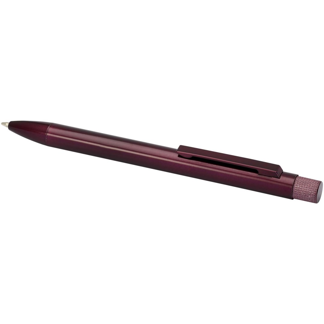 Guľôčkové pero s farebným nástrekom. Tlačidlo a hrot sú vyrobené z mosadze, telo z recyklovanej mosadze a spona zo železa. Farba atramentu: Čierna. Dĺžka písania: 1000 metrov. Rozmer hrotu: 1,0 mm. Dodávané v darčekovej krabičke.