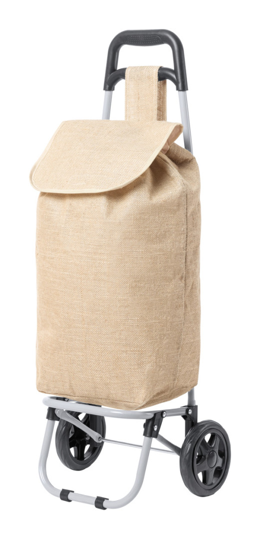 Skladacia jutová nákupná taška so zosilnenými kolieskami a s kovovým rámom, vreckom na zips na zadnej strane a držadlom.