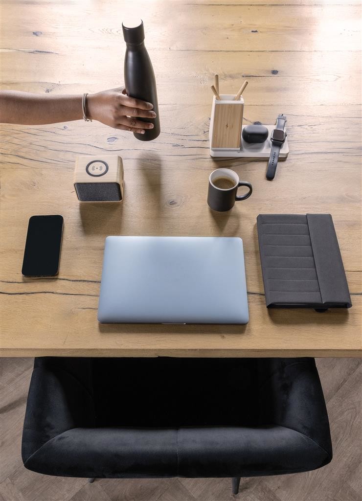 Univerzálna bezdrôtová nabíjacia stanica až pre 3 zariadenia so stojanom na pero. Časť pre telefón je vybavená dvojitou cievkou s maximálnym výkonom 15 W, ďalšou plochou pre ďalší telefón alebo slúchadlá s výkonom 5 W, nabíjačkou pre hodinky s výkonom 2,5 W. Ďalšie USB A a USB C na zadnej strane na nabíjanie pomocou kábla. Vyrobené z recyklovaného ABS plastu RCS. RCS (Recycled Claim Standard) je globálny štandard, ktorý umožňuje overiť použitie recyklovaného materiálu vo výrobku v celom dodávateľskom reťazci. Celkový obsah recyklovaného materiálu podľa hmotnosti výrobku: 73 %. Nabíjacia časť vyrobená zo 100 % bambusu FSC. Súčasťou je 120 cm nabíjací kábel USB-C vyrobený z recyklovaného TPE RCS. Výrobok a príslušenstvo bez obsahu PVC. Balené v darčekovej kraftovej škatuli FSC. Vstup USB C: 9 V/3 A. Bezdrôtové pripojenie. Výstup 1: 9V/1,1A; 9V/1,67A/(15W), bezdrôtový. Výstup 2: 5V/1A (5W), bezdrôtový. 5V/0,5A (2,5W), výstup USB A/USB C.