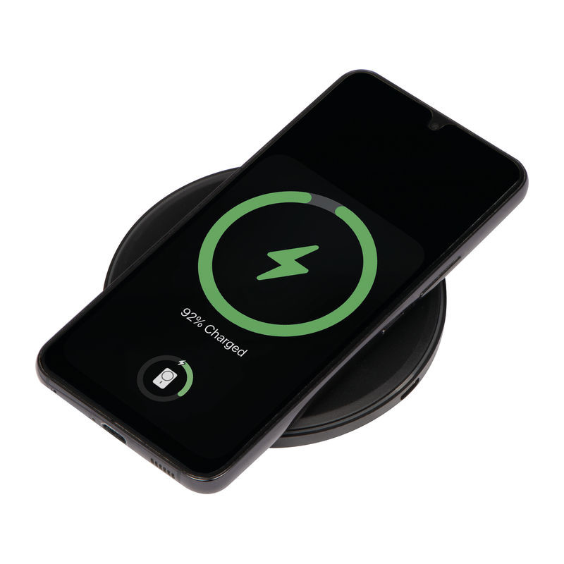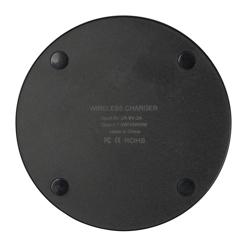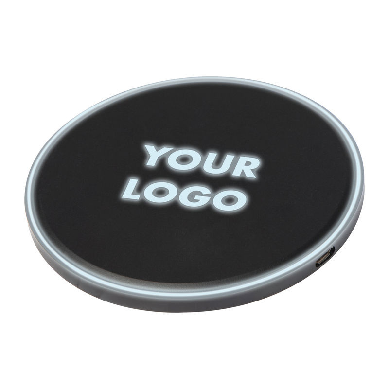 Plastová bezdrôtová nabíjačka s funkciou rýchleho nabíjania (výkon až 10 W) a LED displejom. Zariadenie je pripravené na nabíjanie po rozsvietení zeleného LED krúžka; počas nabíjania svieti modrý LED krúžok. Vaše logo gravírujeme do stredu dosky, gravírovanie svieti počas pripojenia nabíjačky. Vstup: 5V-2A 9V-2A, Výstup: 7,5W/15W/5W (15W rýchle nabíjanie).