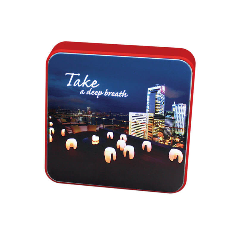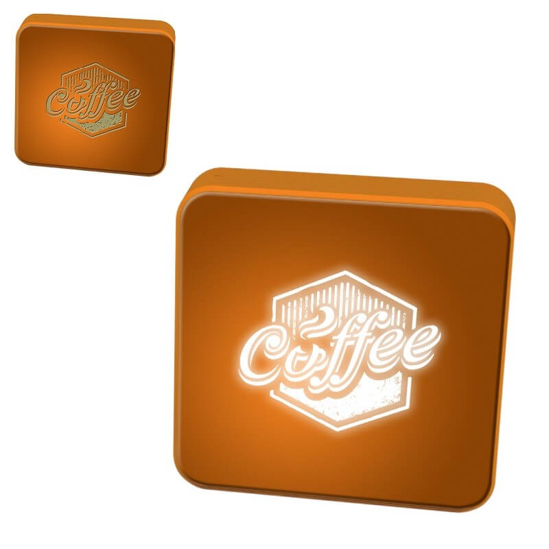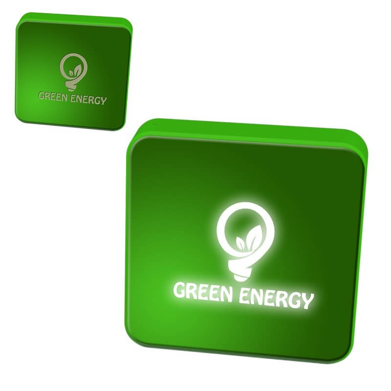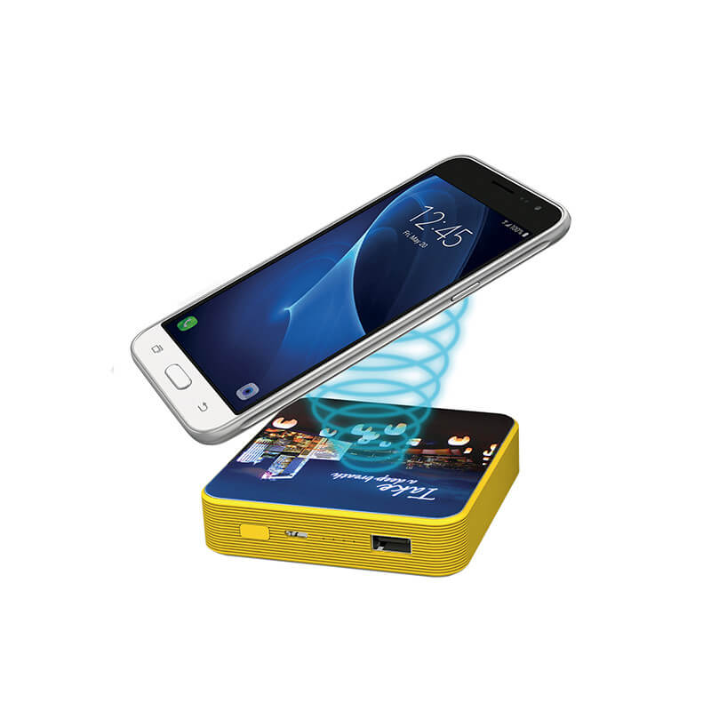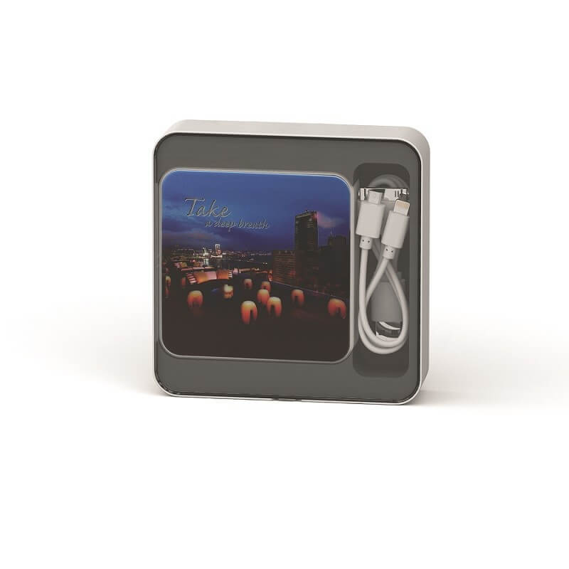 Praktická bezdrôtová power banka s USB výstupom a bezdrôtovým nabíjaním je praktickým vybavením na položenie na stôl či nosenie v taške. Výhodou tejto power banky v štvorcovom tvare je možnosť bezdrôtového nabíjania pomocou indukčnej technológie. V prípade, že váš telefón nemá funkciu Qi nabíjania, je možné ho doplniť externým Qi prijímačom. Možnosť nabíjania aj z klasického USB výstupu potom robí z tejto bezdrôtovej power banky moderný, avšak stále univerzálny darček pre každého. Na prvý pohľad upúta LED podsvietenie, ktoré perfektne zvýrazní vaše logo vytvorené reliéfnym celoplošným CMYK potlačou. Na výber máte z nekonečného množstva farieb, pretože power banku dodávame vo vlastnej farbe z palety Pantone už od 50 kusov! Túto power banku s kapacitou až 6000 mAh môžeme doplniť luxusnou transparentnou krabičkou a nechať tak jedinečnú grafiku vyniknúť už v balení.