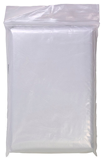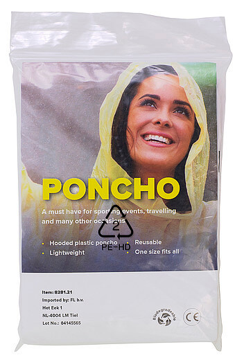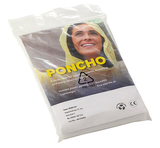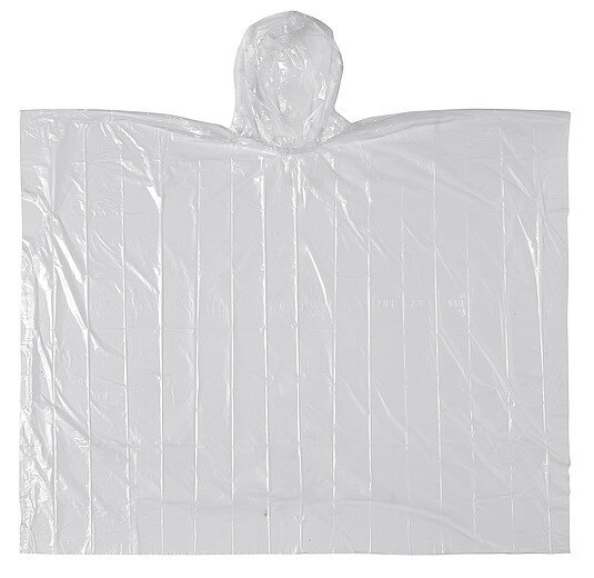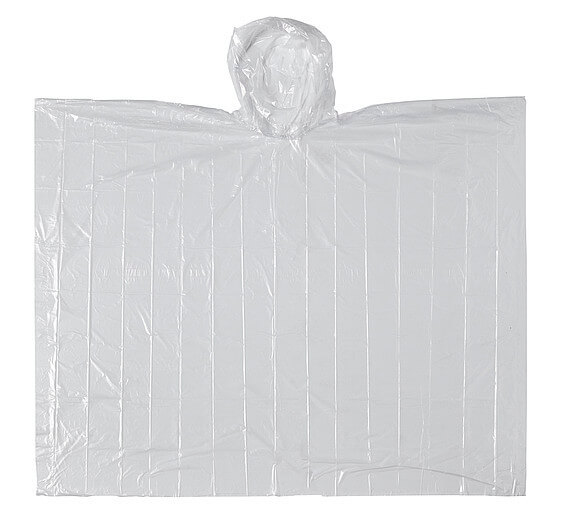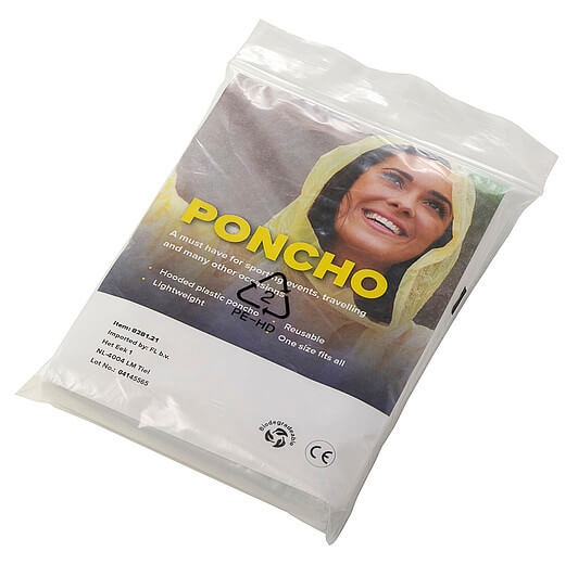 Jednorazové PE, priehľadné pončo v polybagu. Recyklovaný materiál je biologicky odbúrateľný.