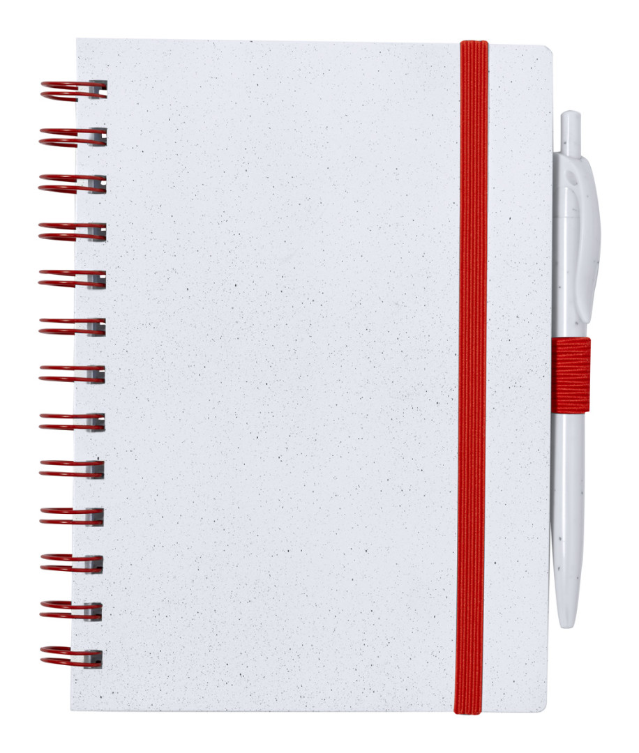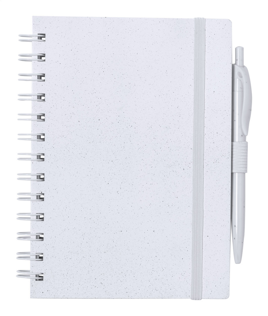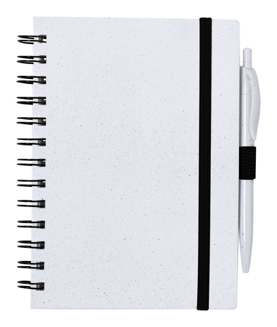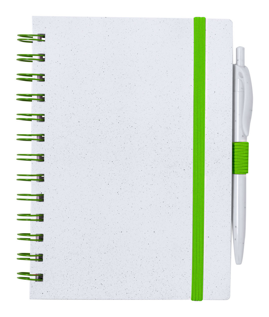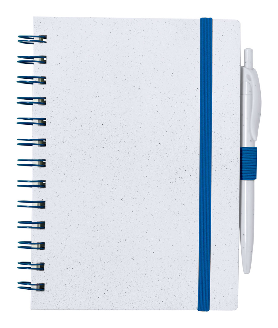 Špirálový zápisník z recyklovaného ABS so 70 linkovanými listami z recyklovaného papiera. So špirálovými krúžkami v rovnakej farbe, gumovým pásikom a držiakom na pero. Vrátane guľôčkového pera z recyklovaného ABS plastu s modrou náplňou.