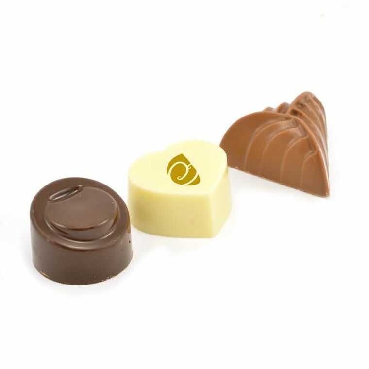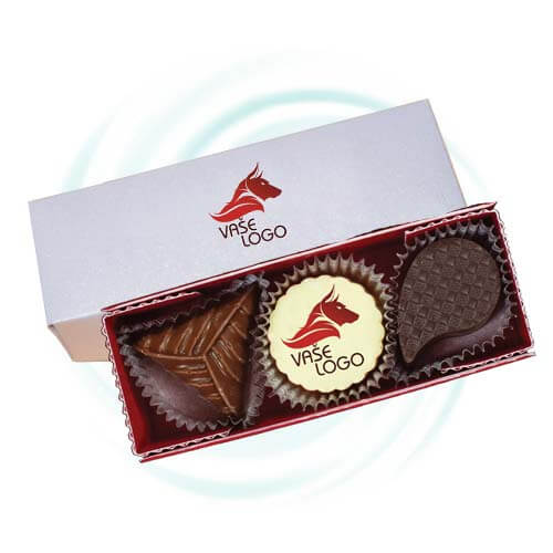 Bonboniéra naplnená tromi sladkými čokoládovými pralinkami podľa vlastného výberu s možnosťou potlačenia vybranej pralinky svojim grafickým motívom (logo, text, slogan, fotka, grafika a iné...).