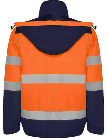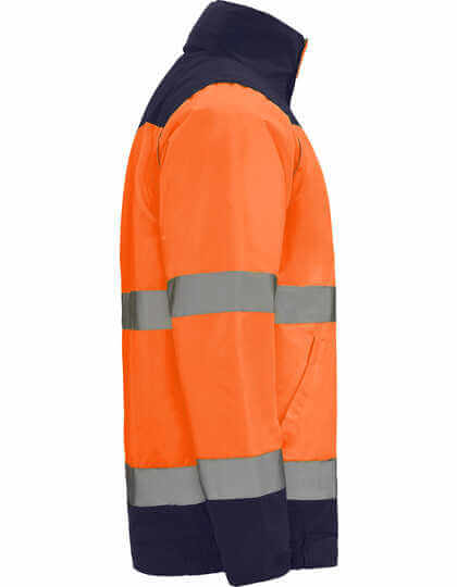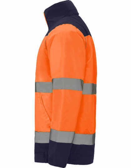 Vonkajšia strana: 100% polyester – vodeodolné, vnútorná strana: 100% polyester, podšívka: 100% polyester, 400g / m² | Reflexné, dvojfarebné | Reflexné prúžky na tele a rukávoch | Kapucňa je k dispozícii s voliteľným fluorescenčným lemom, nastaviteľná na zarážky | Náprsné vrecko na zips | Dve predné vrecká umiestnené pod miernym uhlom | Elastický pás | Elastické manžety s nastaviteľným zapínaním na suchý zips | Reflexný zips po celej dĺžke s fluorescenčným sťahovákom, chlopňou a zapínaním na suchý zips | Vnútorné náprsné vrecko na zips | Odnímateľné rukávy | Odolné proti vetru a dažďu | Certifikované podľa noriem CE: EN ISO 13688:2013 a EN ISO 20471:2013/A1:2016, trieda II | Výrobca garantuje reflexnú vlastnosť podľa normy EN pre 25 pracích cyklov do 30°C