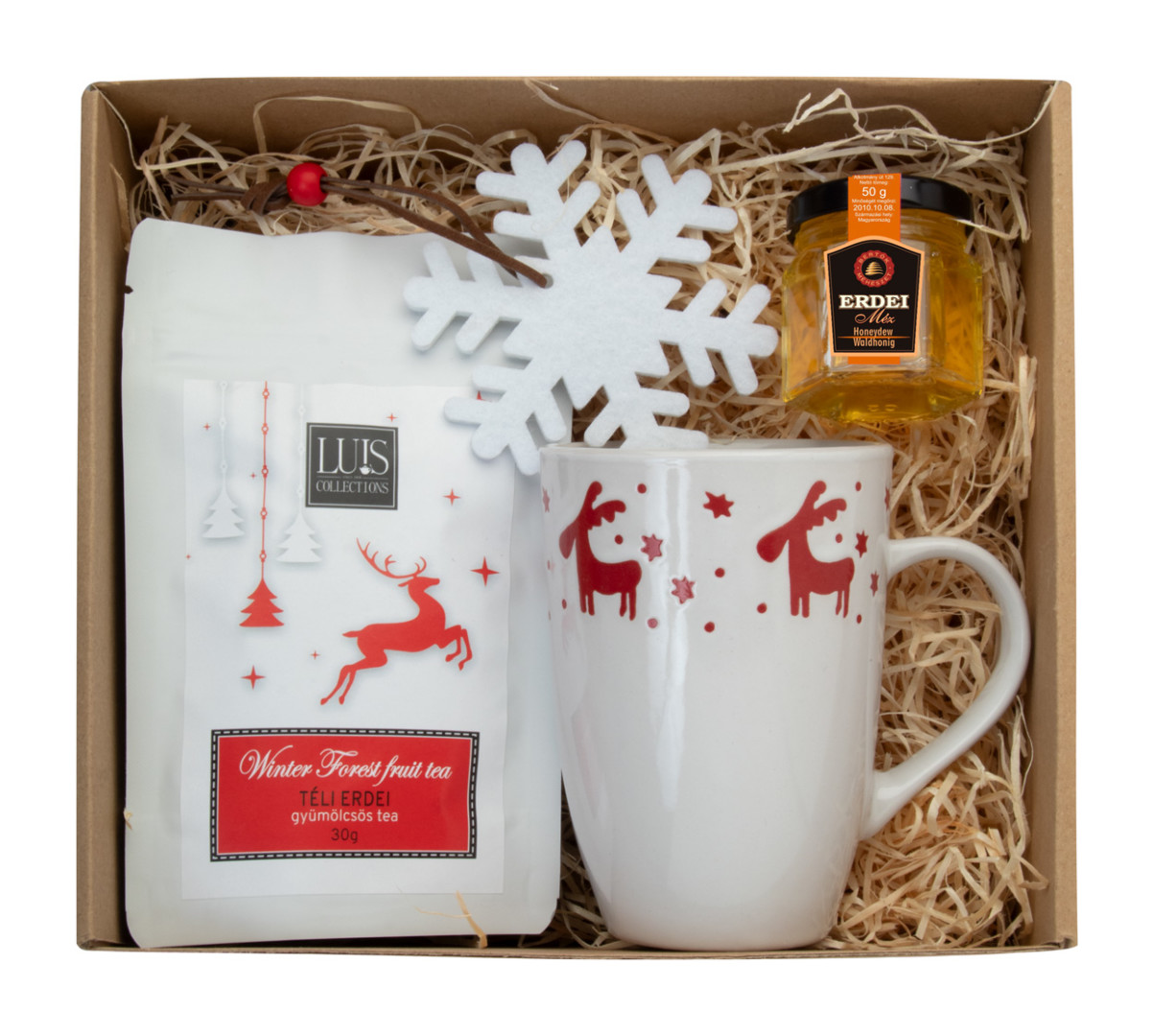Čajová darčeková sada v kraftovej kartónovej darčekovej krabičke s výplňou z drevitej vlny a červenou stuhou. Obsahuje: vianočný hrnček "Lempaa"; Zimný lesný ovocný čaj "Luis" (30 g); Lesný med "Always Gourmet" (50 g); "Fantasy" ozdôb na vianočný stromček.