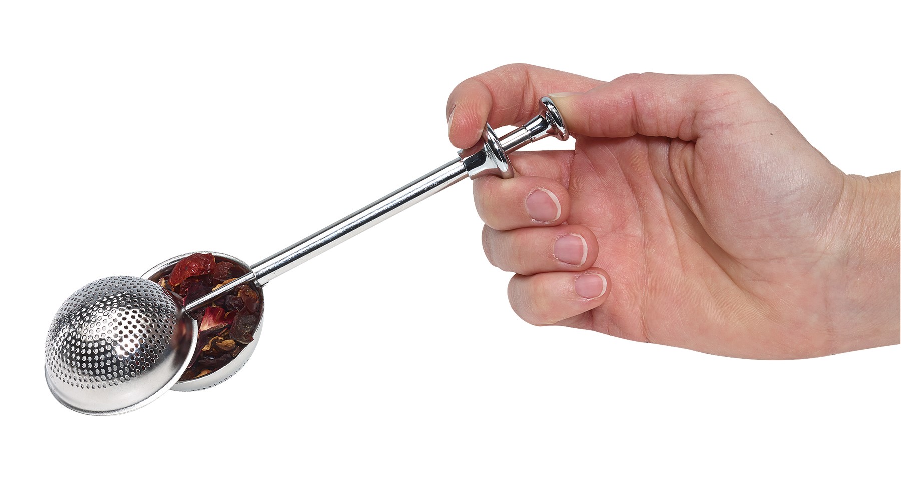 Čajové nerezové sitko "Sweet Tea": Ideálna dávka pre šálky alebo malé čajové hrnčeky - pohodlná manipulácia jednou rukou, guľovité sitko s pružinou sa otvorí cez posuvný mechanizmus a udržuje čaj pevne usadený, možno umývať v umývačke, v darčekovej krabičke