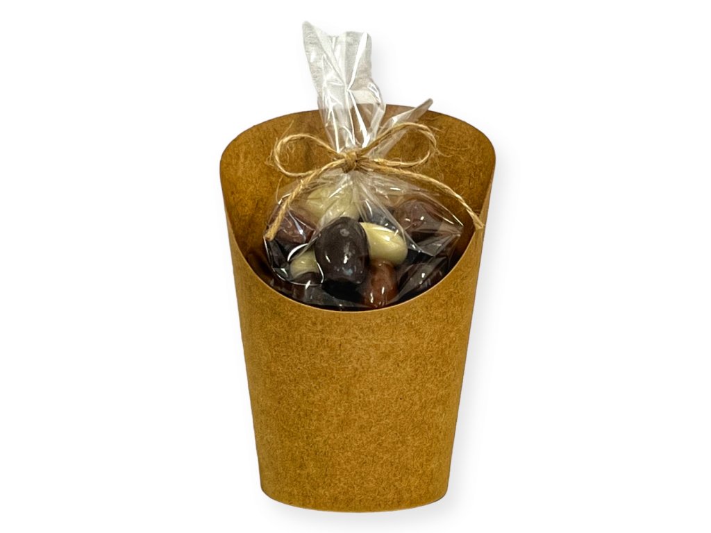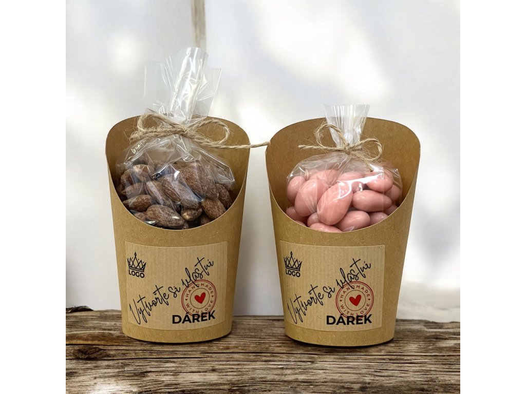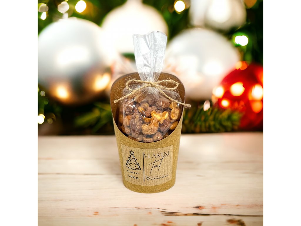 Vytvorte si originálny mini darček: celofánové vrecúško a kelímok s orechmi a etiketou na mieru. Vyberiete si zloženie, farby aj text; my všetko ručne zabalíme a zladíme s vašou značkou. Hodí sa na konferencie, welcome balíčky aj sezónny gifting. Kalkulácia podľa počtu kusov, obsahu a grafiky. Cena 180 g kešu natural 5,61 €