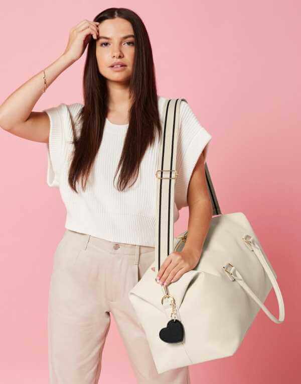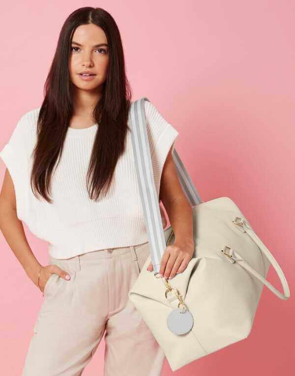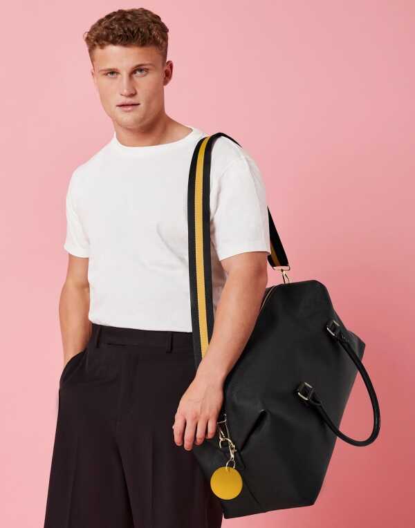 100% polyuretán (kožený vzhľad), jemné Saffiano s mäkkou podšívkou na dotyk, rukoväte na prenášanie z rovnakého materiálu, odnímateľný nastaviteľný popruh cez rameno, extra dlhá hlavná priehradka na zips pre ľahký prístup, lesklé kovové detaily, vnútorné vrecko na cennosti na zips, vnútorný základný panel s ochrannými nožičkami, štítok TearAway pre jednoduchú zmenu značky, kapacita: 25 litrov, rozmery: 53x26x24 cm, max. plocha pre výšivku: 15 obrúčok, max. tlačová plocha: 15x15 cm