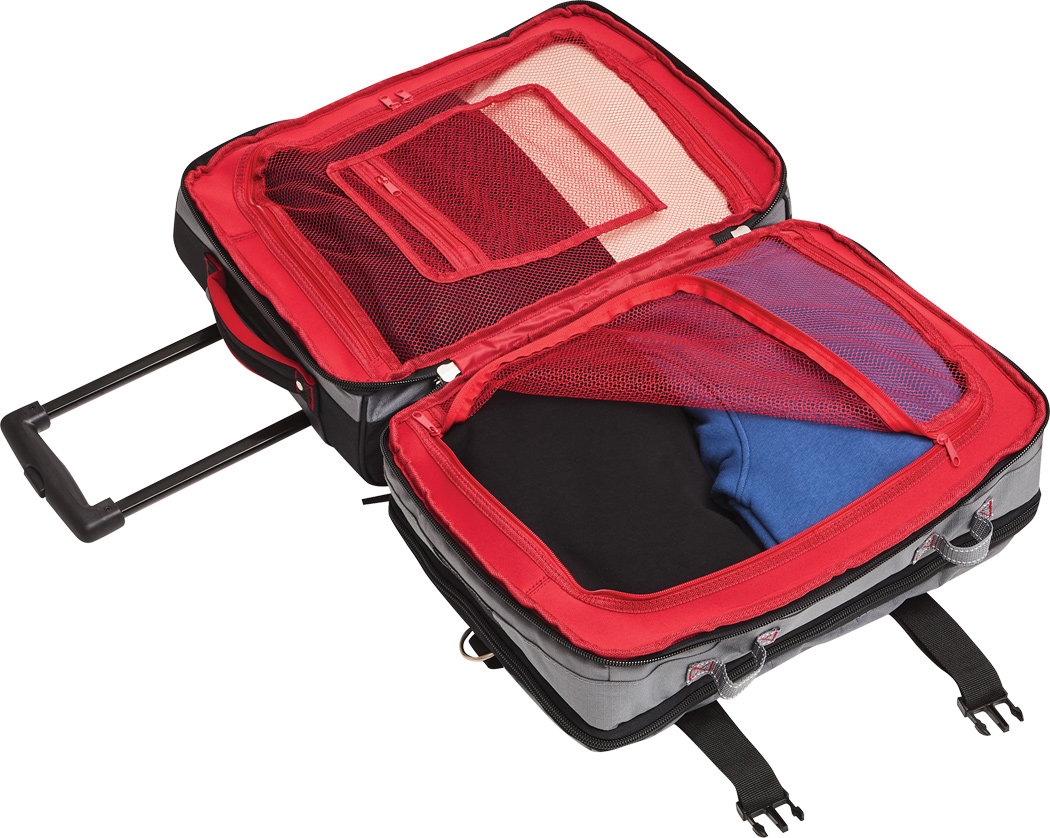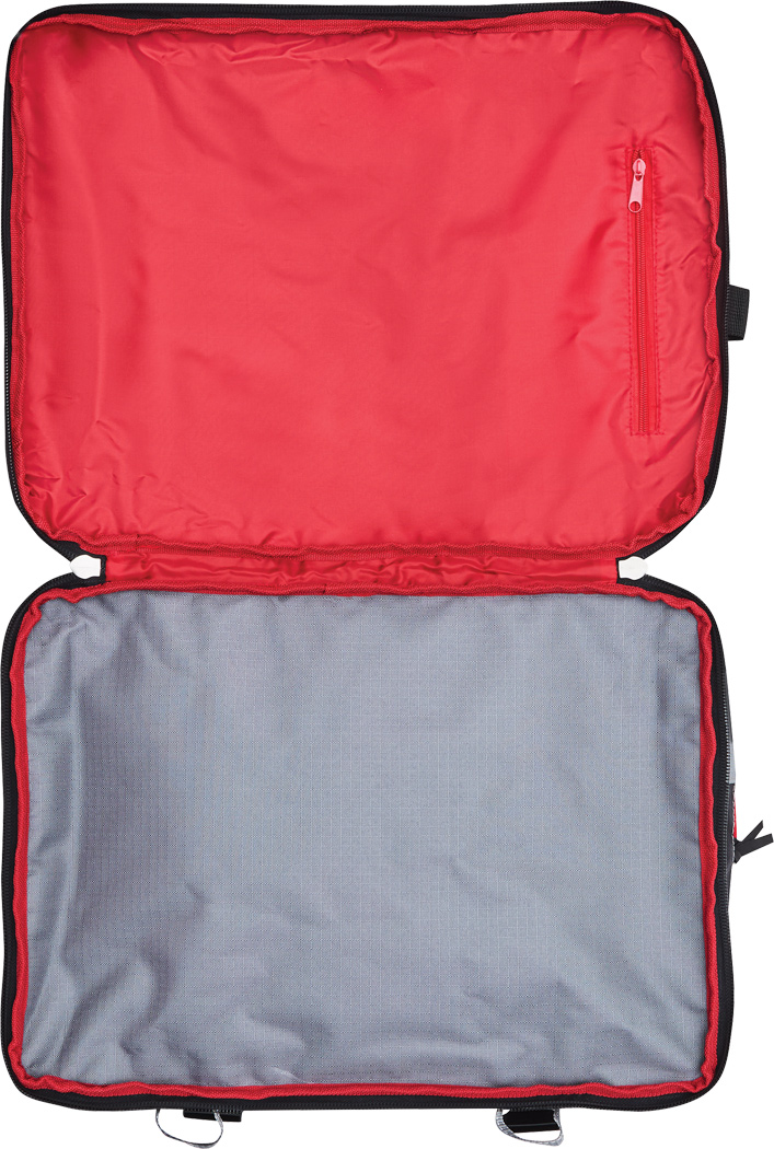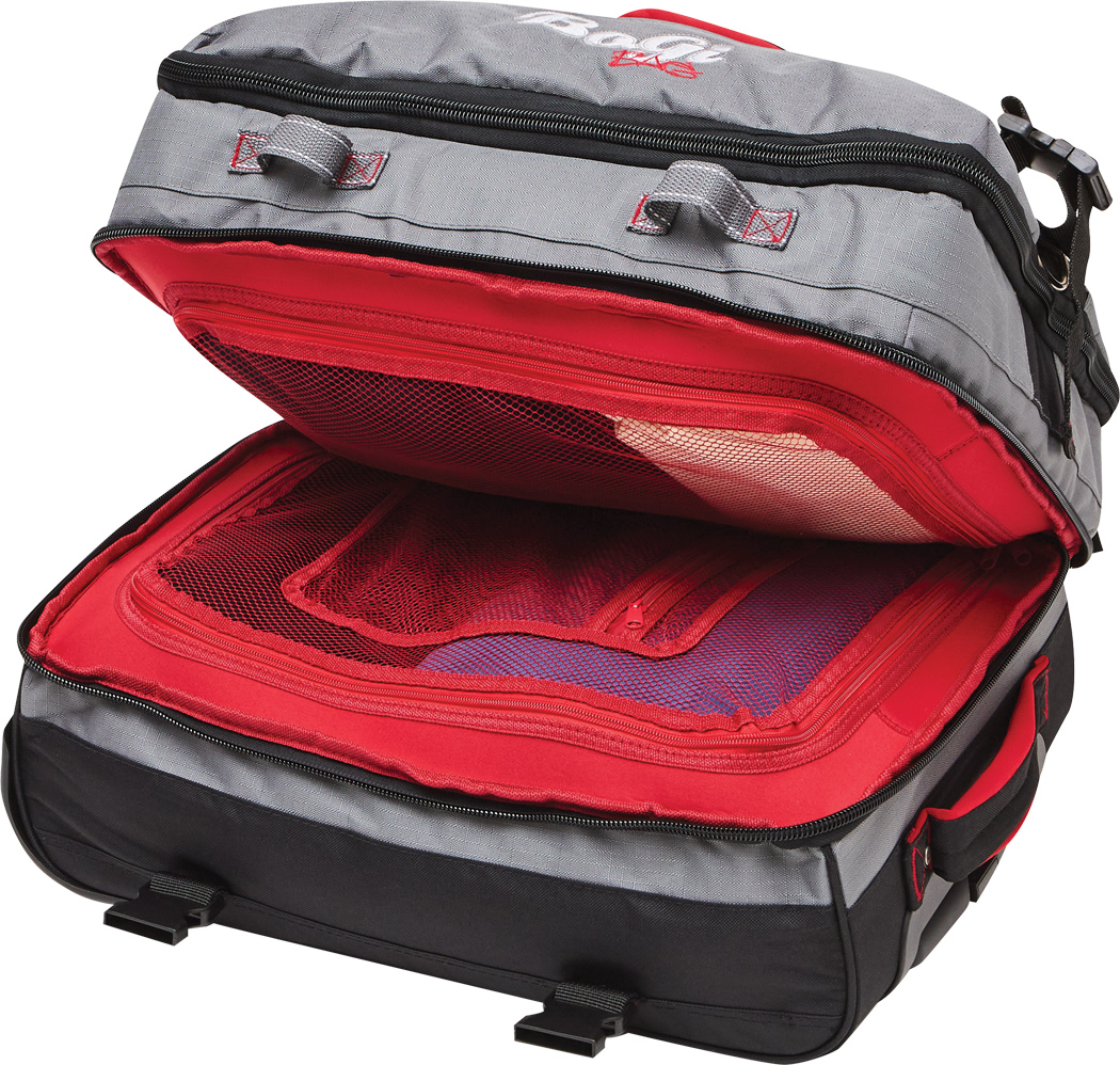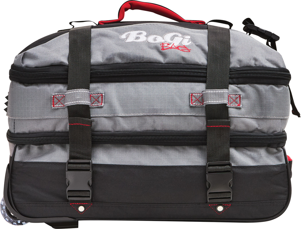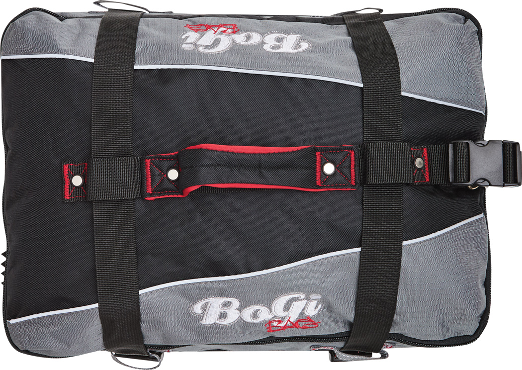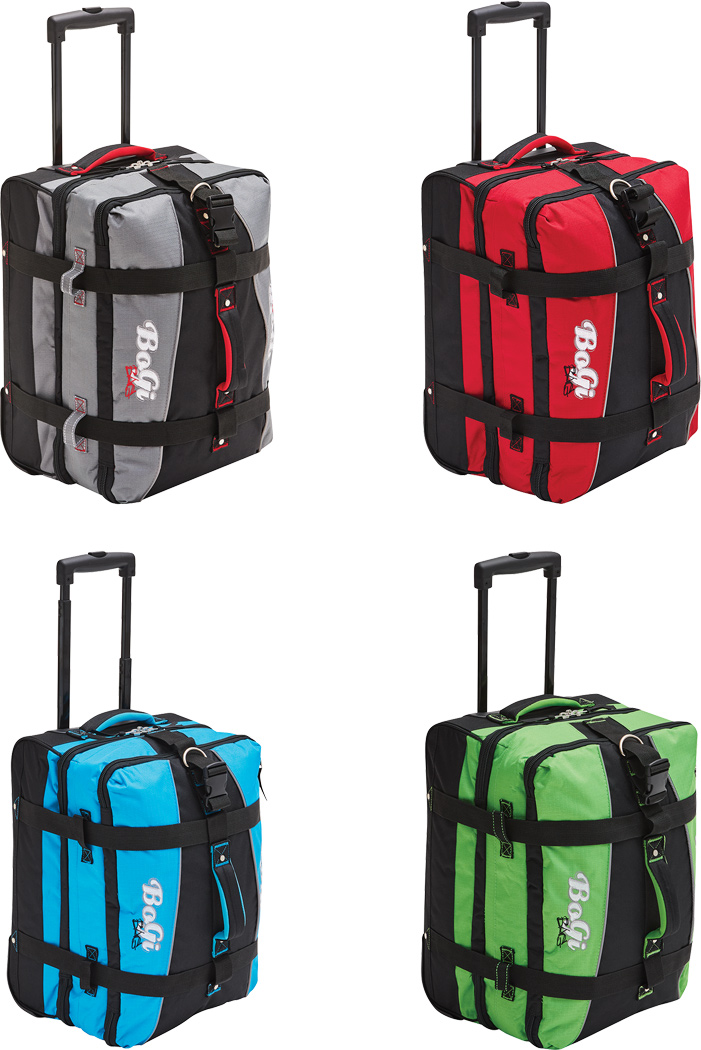 Cestovná taška na kolieskach BoGi S: samostatné úrovne balenia so zipsom, hlavná priehradka s 2 prepážkami, 1 sieťované vrecko na zips na jednej z prepážok, 2 vnútorné vrecká na zips, 2 polstrované držadlá, zasúvateľný rám, 2 popruhy so zapínaním na patentky, priehradka na adresu na zadnej strane, kolieska s hladkým chodom, ochrana hrán, 2 koľajničky na prepravu po schodoch a nožičky v spodnej časti, súčasťou balenia je kombinačný zámok.