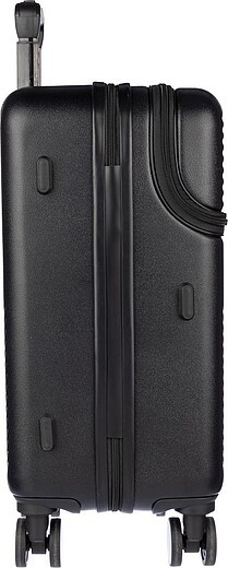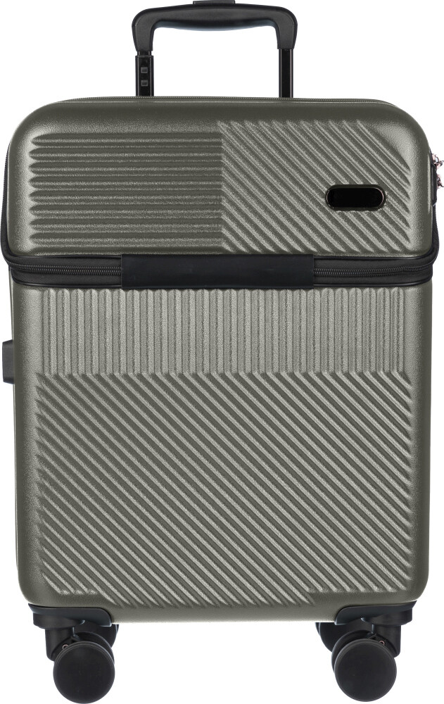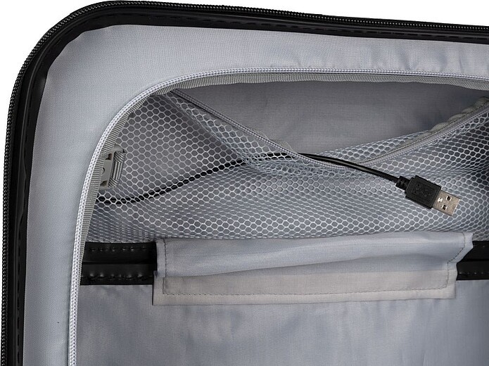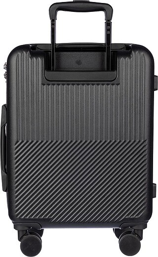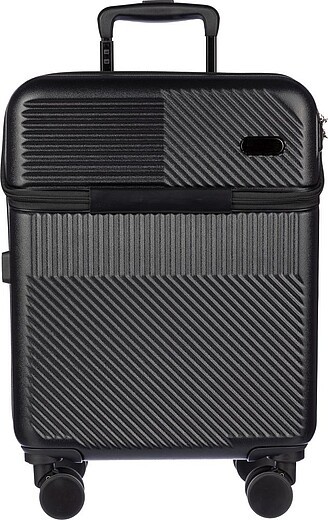 Plastový cestovný kufor s predným vreckom na laptop uzatvárateľným na zips. Kufor má 8 koliesok, trojúrovňový systém rukoväte, číselný zámok a pliešok na vylaserovanie Vášho loga. Obsahuje USB port. Rozmery: 40 × 24 × 54 cm. Cena nezahŕňa recyklačný poplatok.
