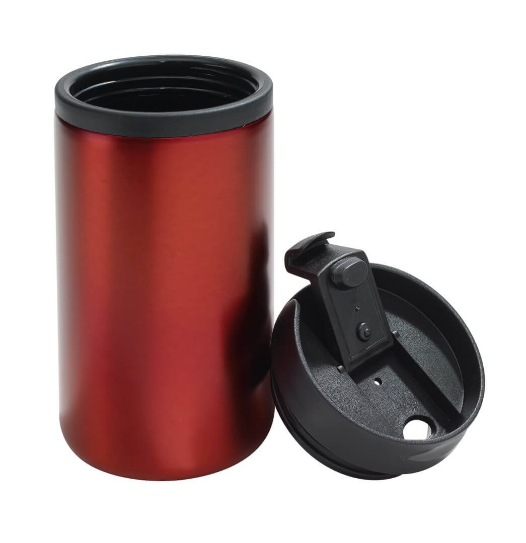 Cestovný hrnček "Take Fast", dvojstenný: vonkajšia časť z nerezovej ocele, vnútorná časť z plastu, plastové viečko s bezpečným šróbovacím uzáverom a integrovaným otvorom na pitie, pogumované dno pre dobrú priľnavosť, kapacita cca. 290 ml, v darčekovom balení