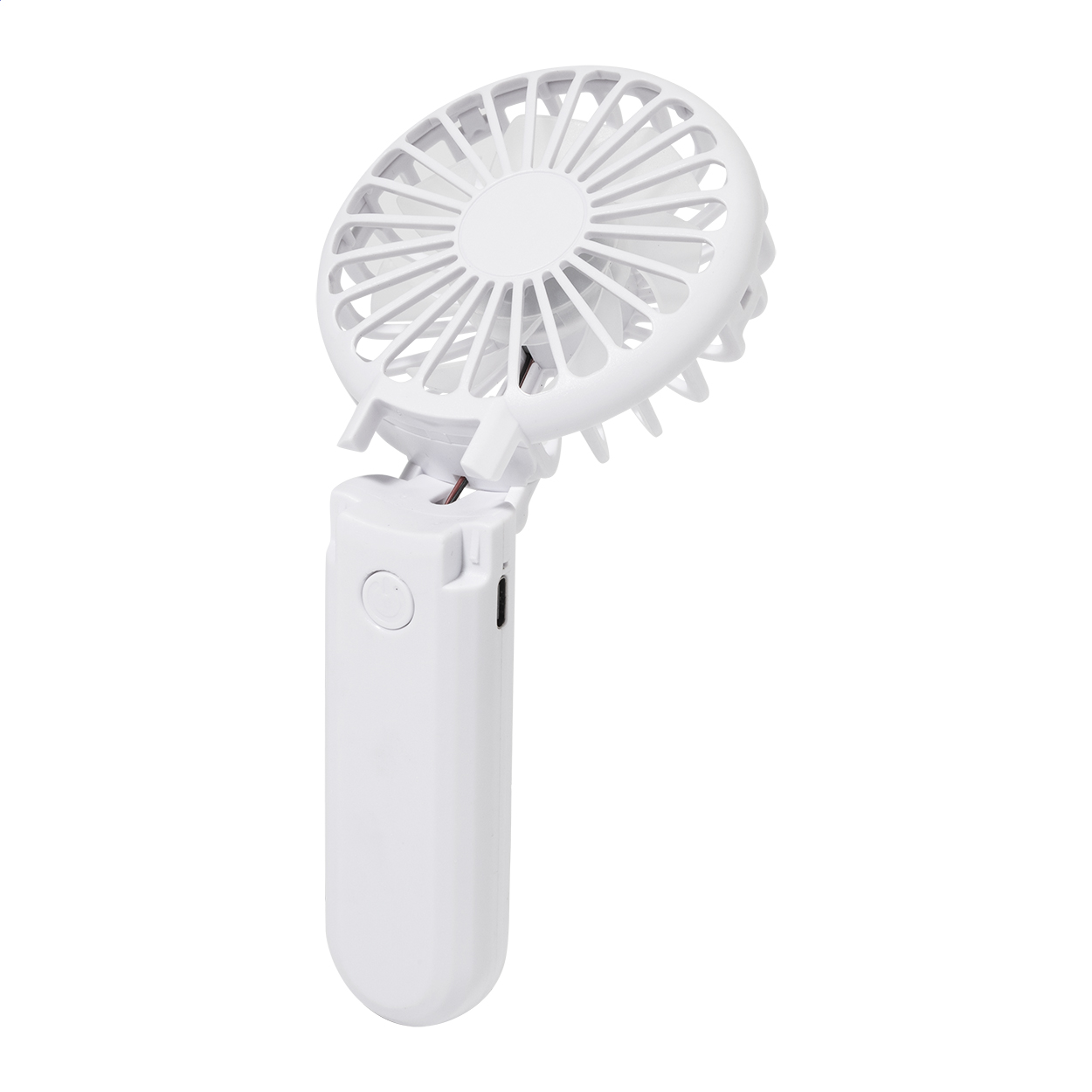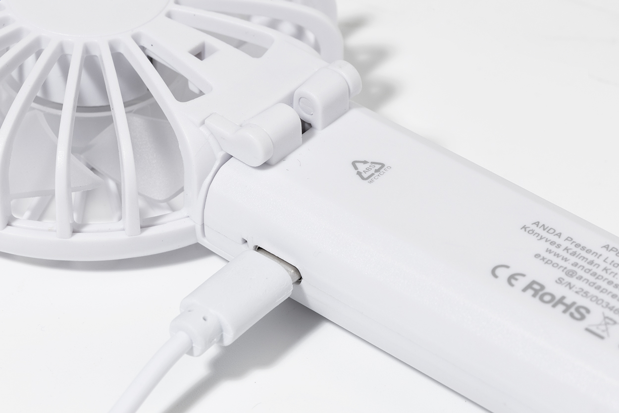Elektrický ručný vetráčik z recyklovaného ABS plastu so vstavanou dobíjacou batériou cez USB (400 mAh). S nastaviteľným uhlom hlavy a 3 rýchlosťami. Vrátane USB kábla na nabíjanie. New. Go Green