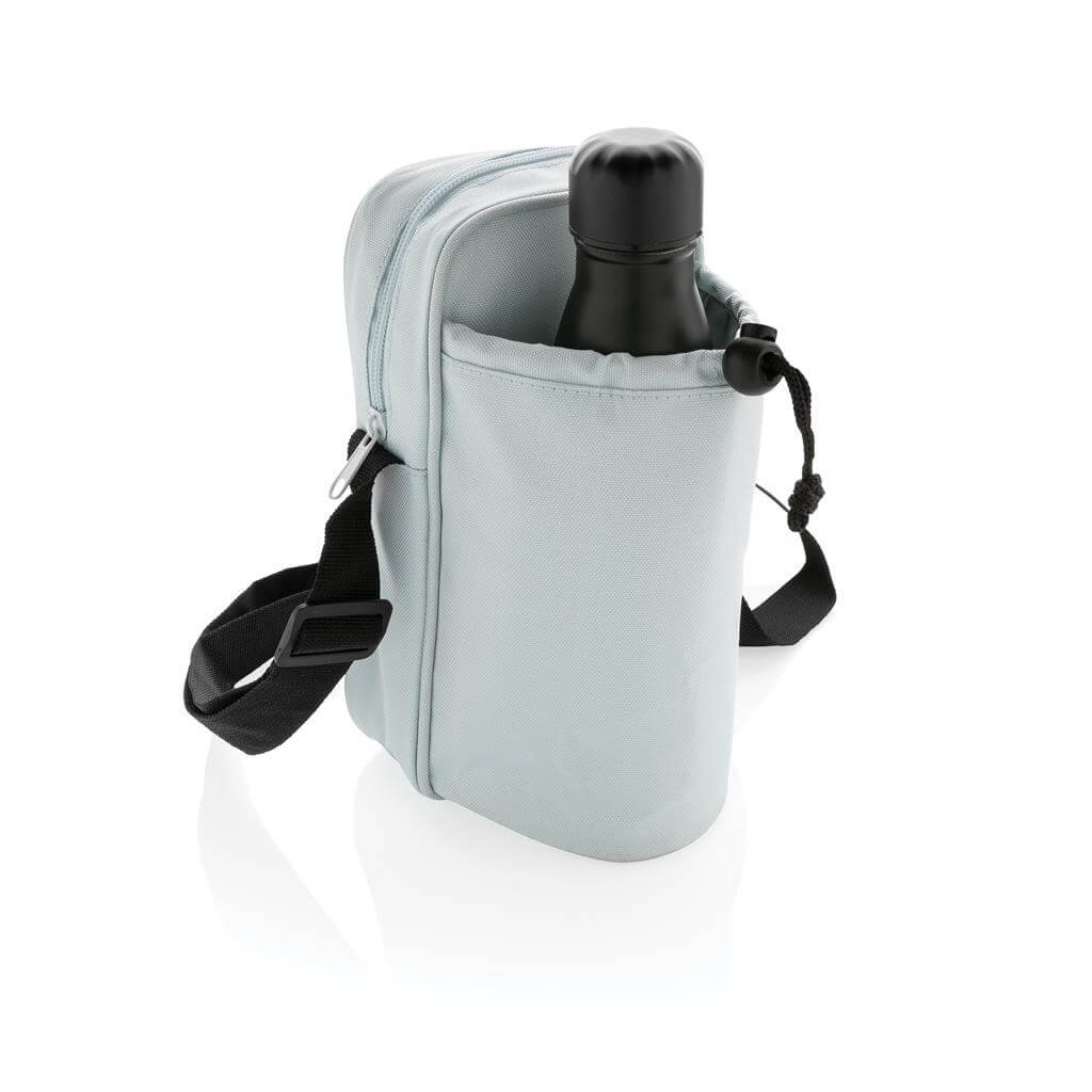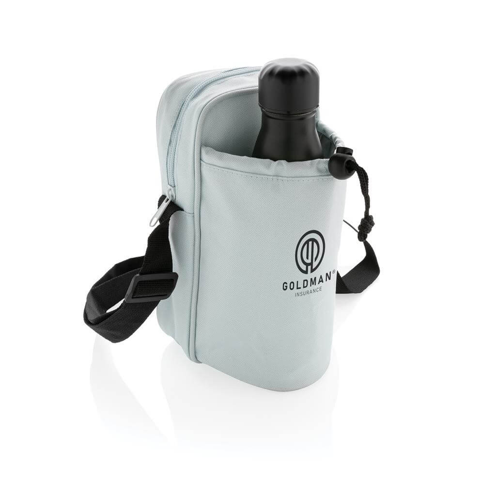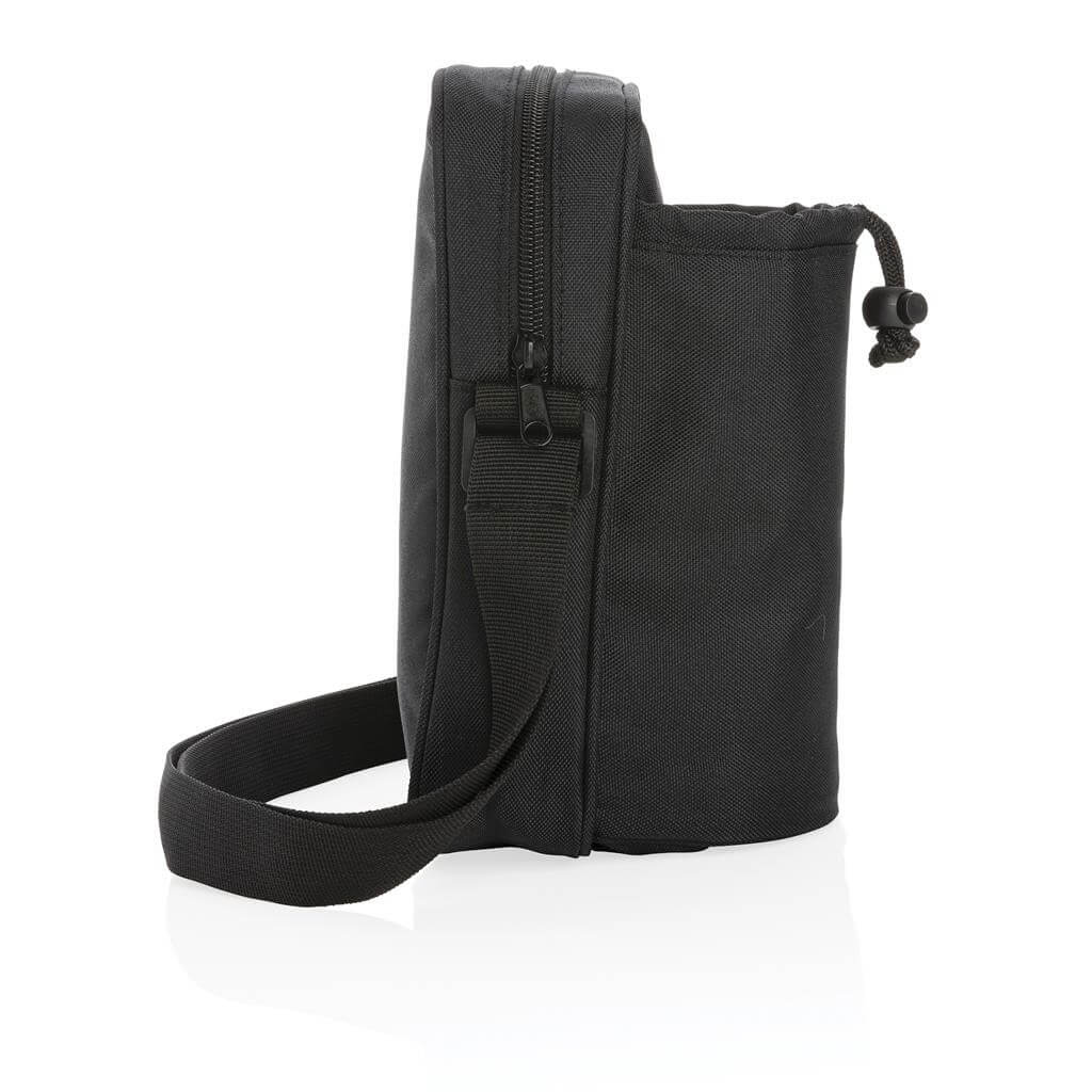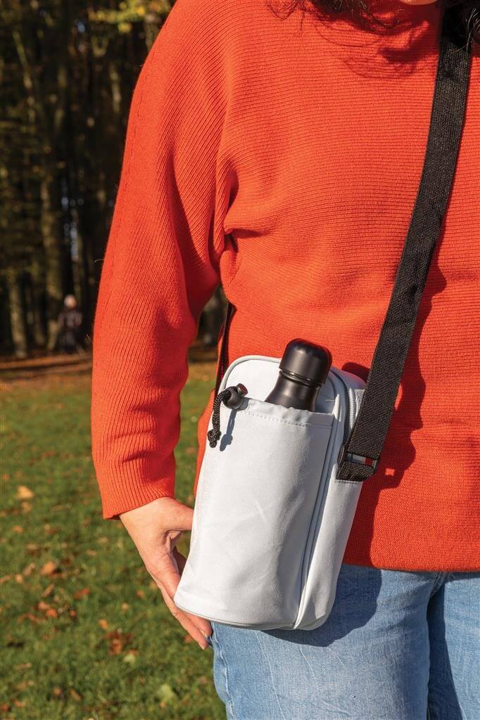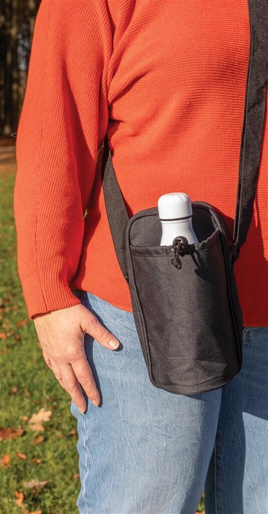 Unikátna chladiaca taška s priečnym popruhom pre pohodlné nosenie a voľné ruky pri outdoorových aktivitách. Hlavná priehradka na zips, sťahovacie šnúrky na prenos fľaše. Ideálna veľkosť fľaše je 25 x 7,5 cm. Prispôsobiteľný ramenný popruh. Vonkajší materiál 600D polyester, vnútorný 210D polyester a PEVA. Bez PVC .