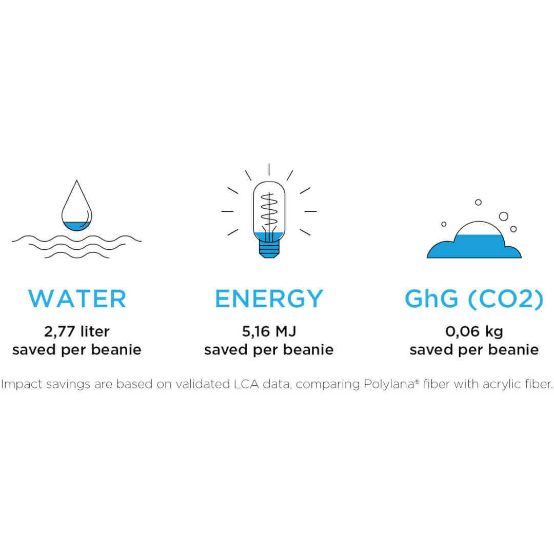 Reklamná čiapka z udržateľných materiálov. Jednovrstvová beanie čiapka s dvakrát preloženým okrajom. Pútko so značkou. Vlákno Polylana® je šetrnou alternatívou k vláknam zo 100% akrylu a vlny. Šetrí vodu, energiu a znižuje emisie CO2 pri výrobe výroby a farbenia. V porovnaní s akrylovými vláknami je pri každej čiapke Polylana® dosiahnuté nasledujúce úspory: 2,77 litra vody, 5,16 MJ energie a 0,06 kg GhG (CO2). Úspora vplyvu je založená na validovaných dátach LCA (Life Cycle Assessment).