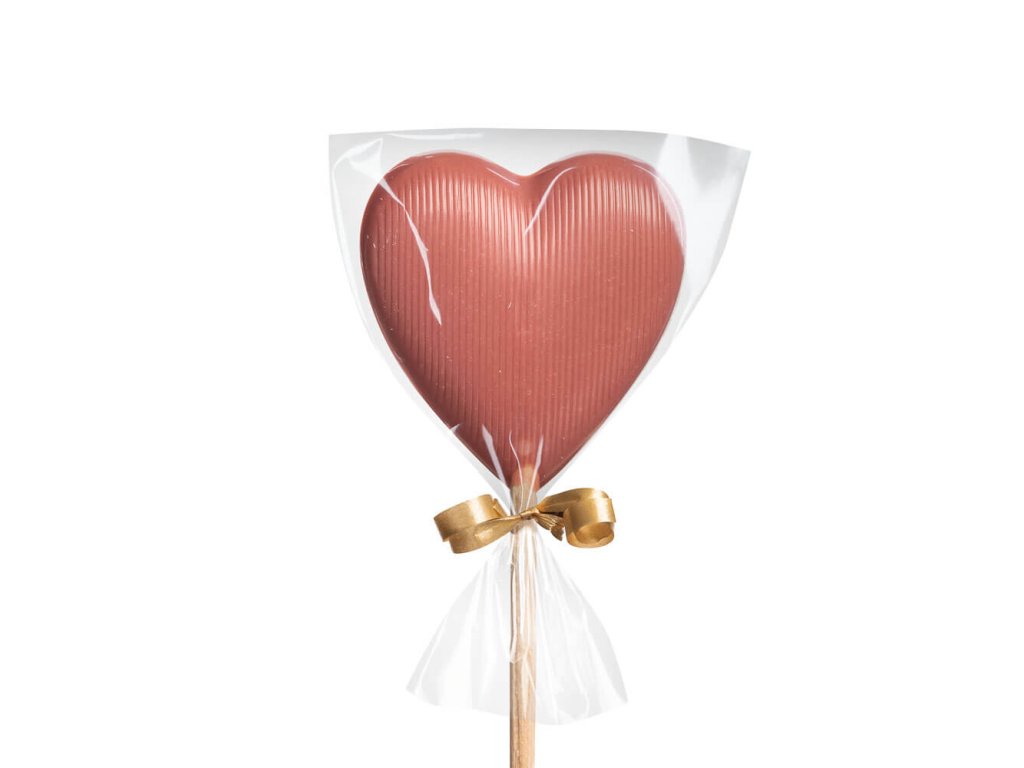 Čokoládová lízanka je našou odpoveďou na to, ako si nezašpiniť ruky od čokolády. Sladká ružová čokoláda s vôňou vanilky. Bez príchutí a esencií. Ale pravé vanilkové zrnká. Srdiečko, ktoré vonia, chrumká a pomaly sa rozplýva na jazyku. A prečo ruby? Pretože čokoláda nemusí byť len mliečna, tmavá a biela. Ružová je prirodzenou farbou špeciálnych kakaových bôbov. A ruby čokoláda je novou príležitosťou na chuťovú provokáciu. Príjemná. Jedinečná.